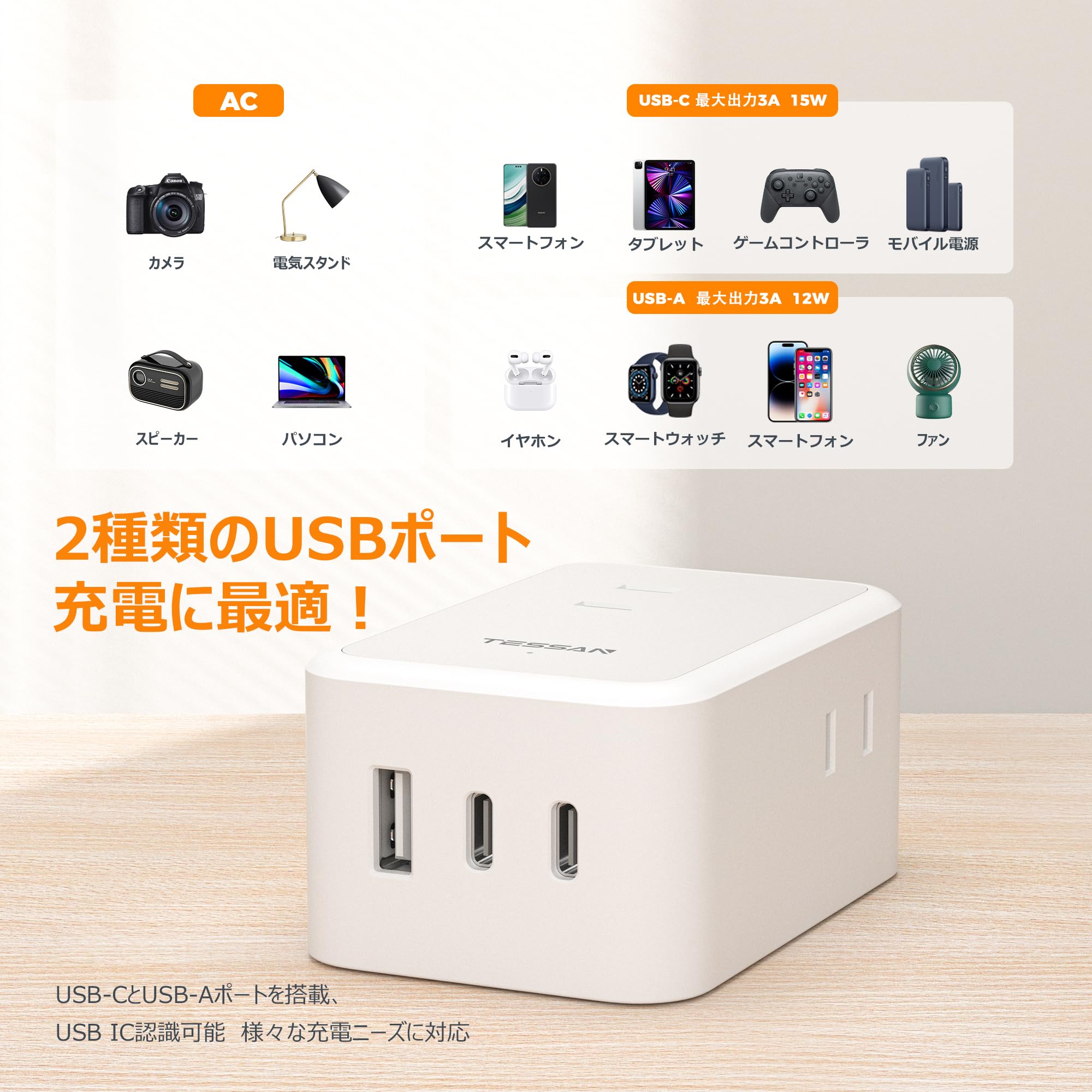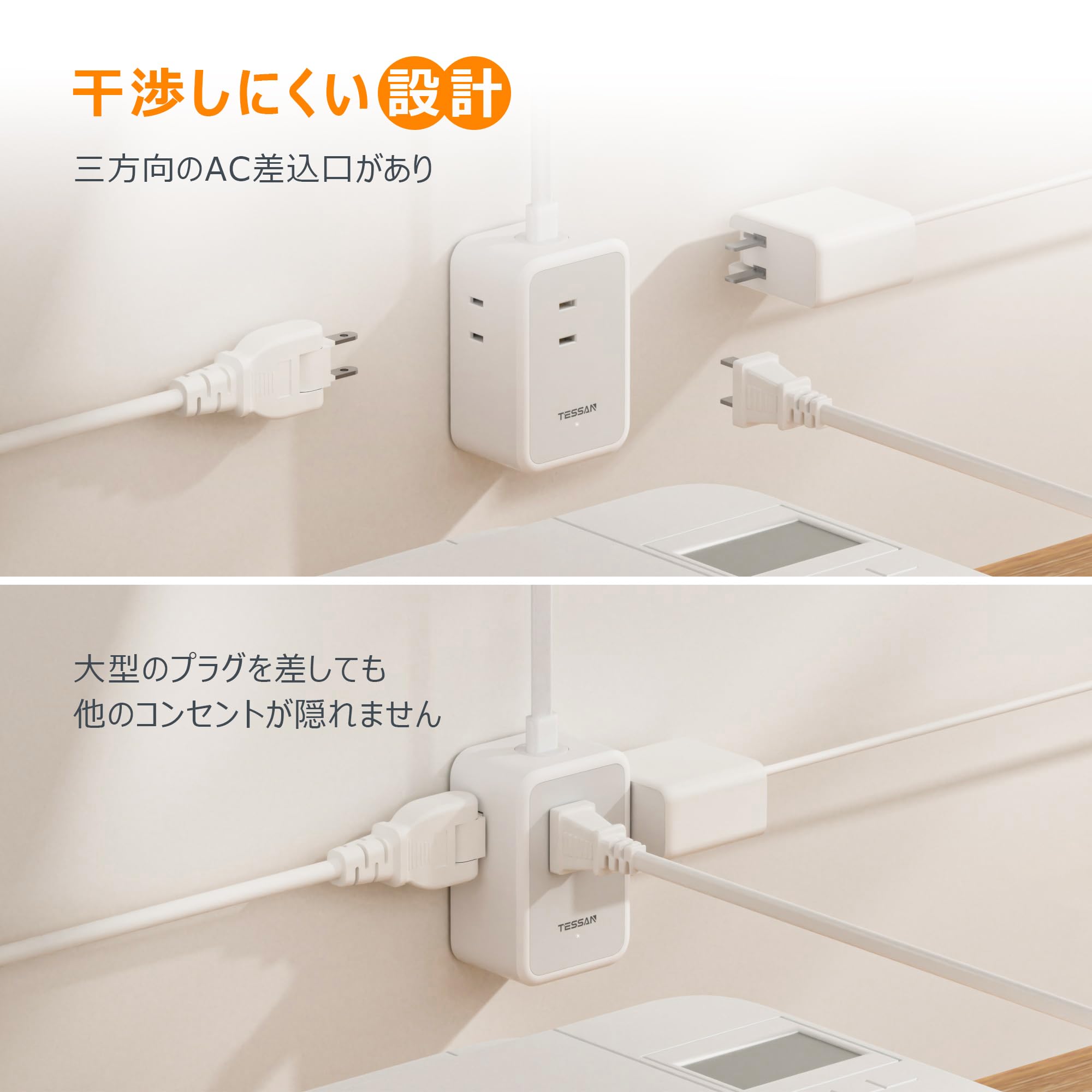 延長コード 2m 薄型 電源タップ usb コンセントタップ たこあしコンセント テーブルタップ TESSAN 3個AC 2個タイプC 1個タイプA 電源コード type-c タコ足配線 隙間