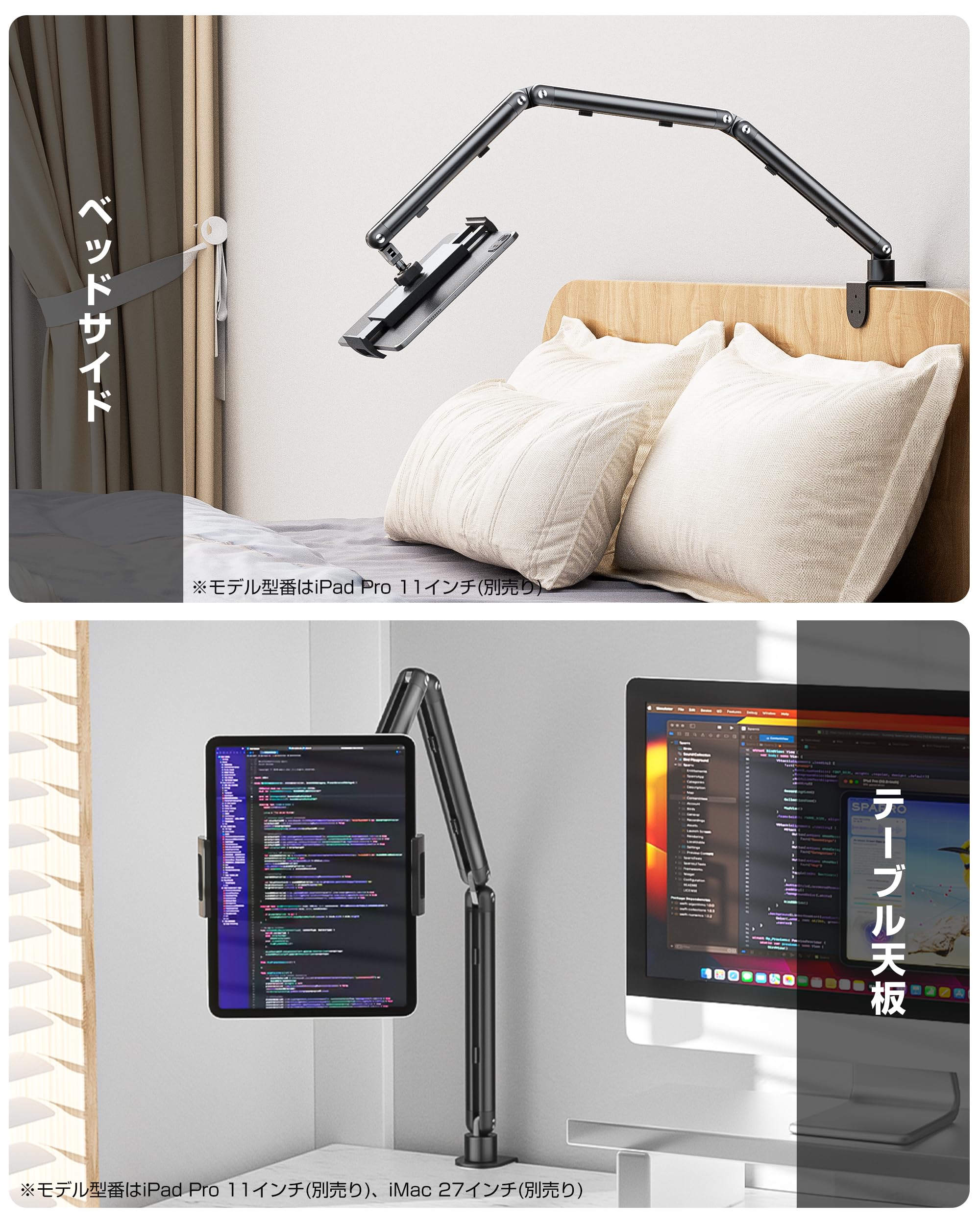 KUUVAN タブレット スタンド iPad アーム 寝ながら アルミ製 8関節 4.7-17.3インチ対応 耐荷重1.2KG 縦横両対応 広範囲可動 俯瞰撮影 ケーブルガイド 折りたたみ スマホ/タブレット/15.6型,17.3型モバイルモニタ対応(ブラック)