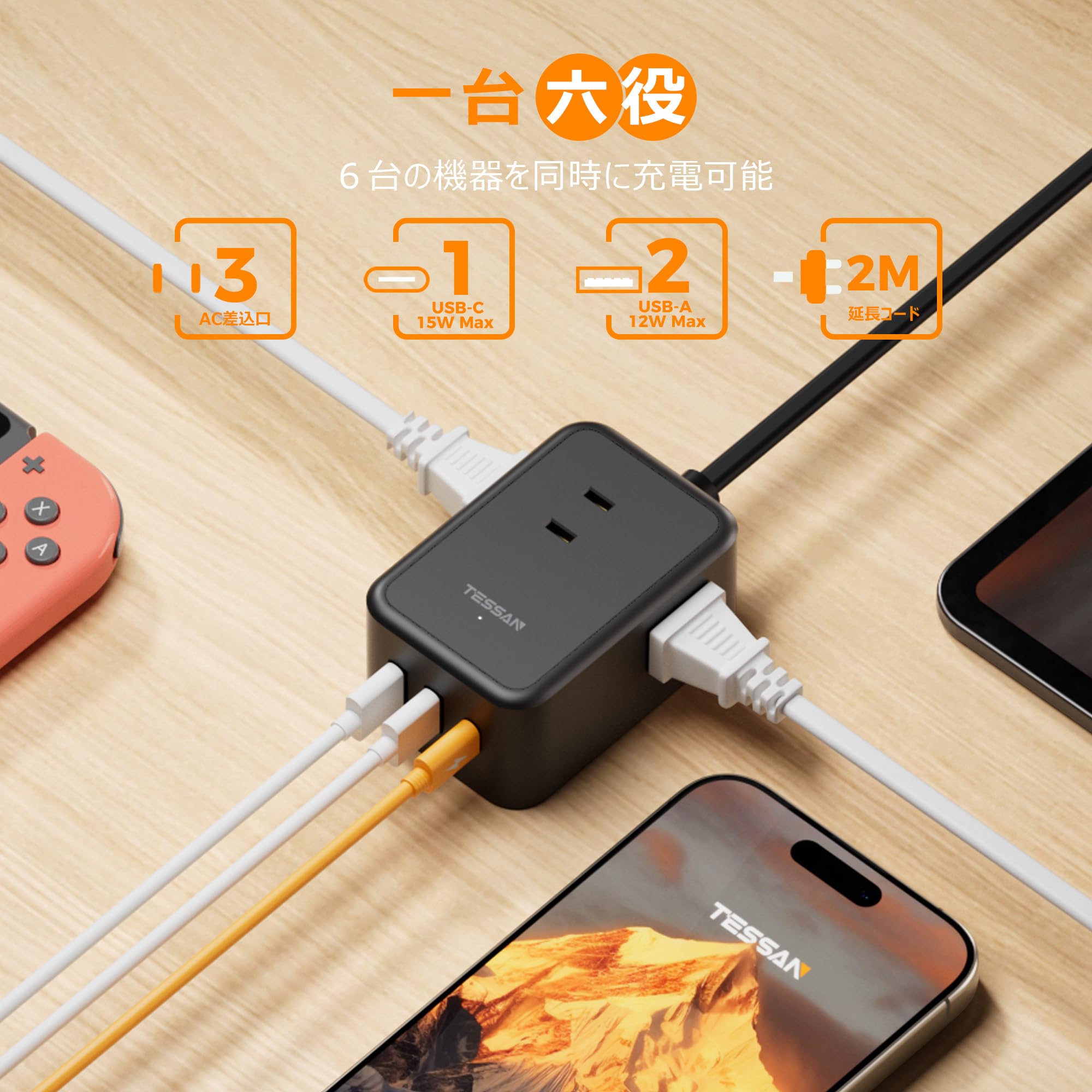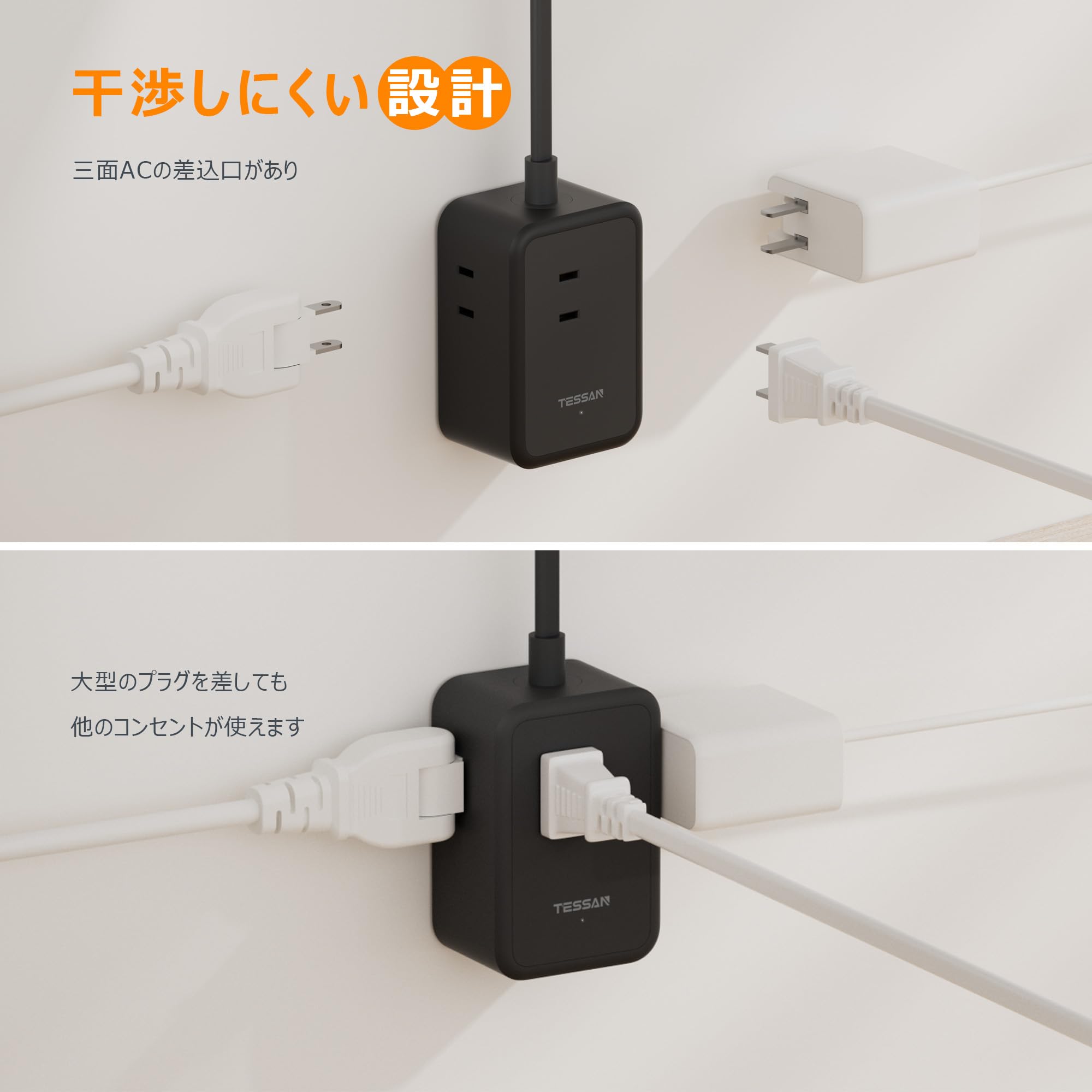 延長コード 2m 黒 薄型 電源タップ usb コンセントタップ たこあしコンセント テーブルタップ TESSAN 3個AC 1個タイプC 2個タイプA 電源コード type-c タコ足配線 隙間