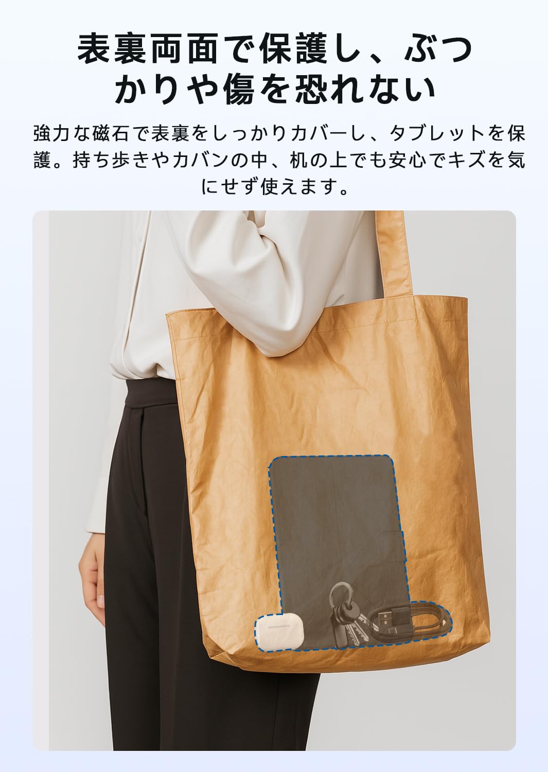 バッグの中で他の物と接触してもキズが付きにくく、大切なタブレットを全方位でしっかり守ります。