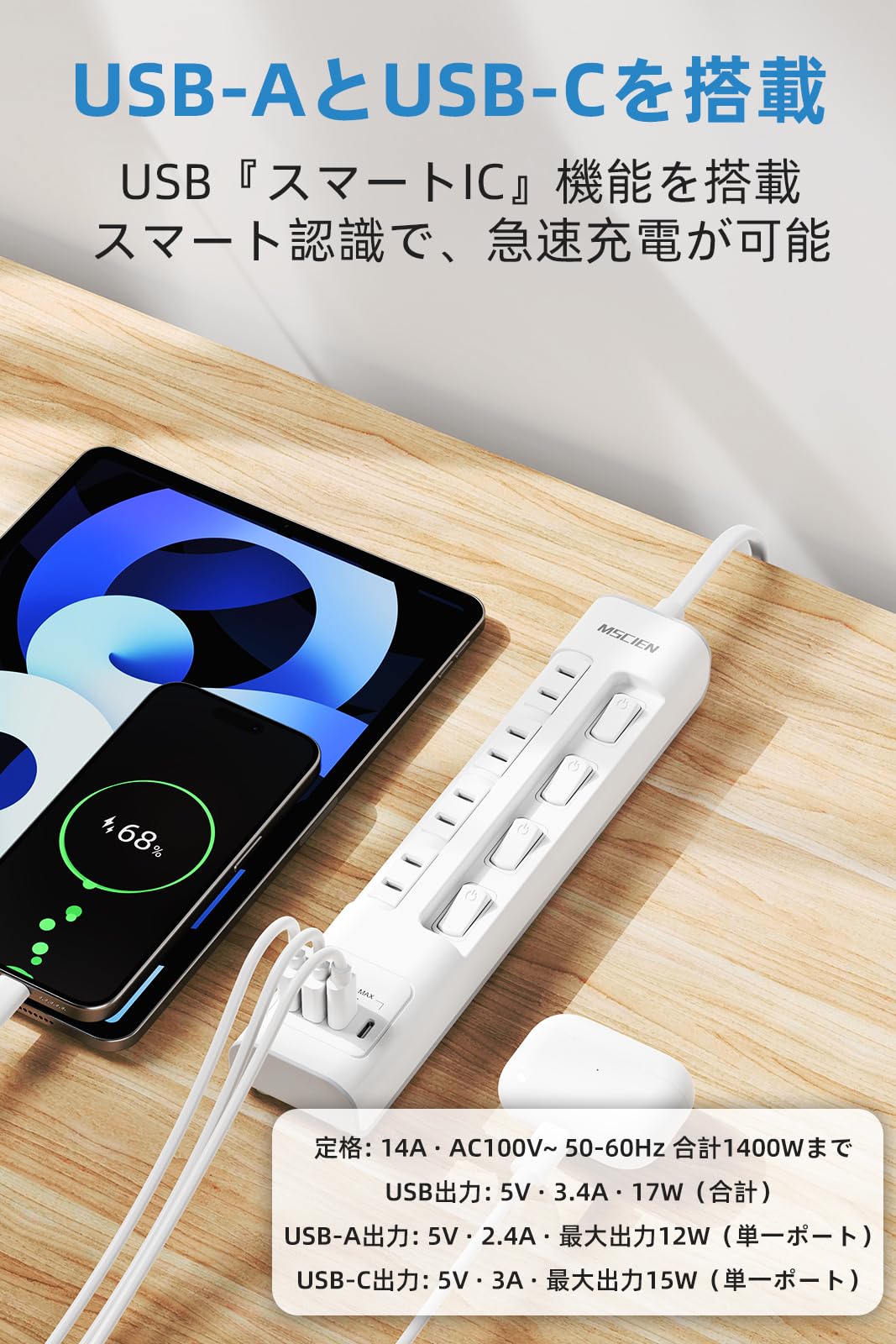 Mscien 電源タップ 回転 延長コード 2m コンセント 向き変換 ローリングタップ 向きを変える たこあしコンセント 回転式 usb テーブルタップ 4個AC口2個USB-A 2個USB-C 個別スイッチ スイングプラグ 壁掛け おしゃれ エムサイン