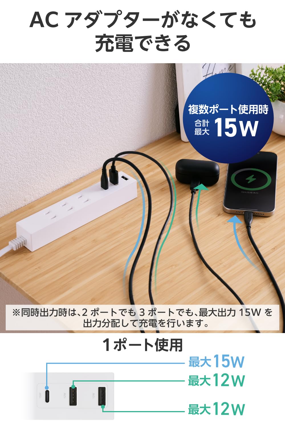 エレコム 電源タップ USB コンセント 15W AC×3個口 USB-A×2 USB-C×1 1.5m 極性プラグ対応 (N極) ホワイト ECT-38-3A2C15WH