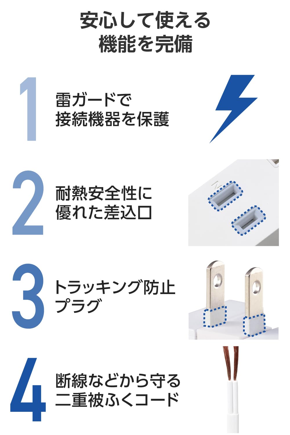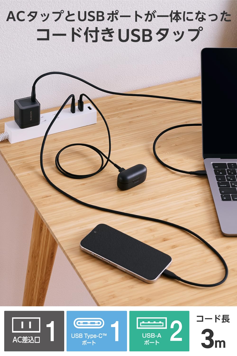 ■ ACタップとUSBポートが一体になった、スマートフォンやワイヤレスイヤホンなどを充電できるコード付きUSBタップです。