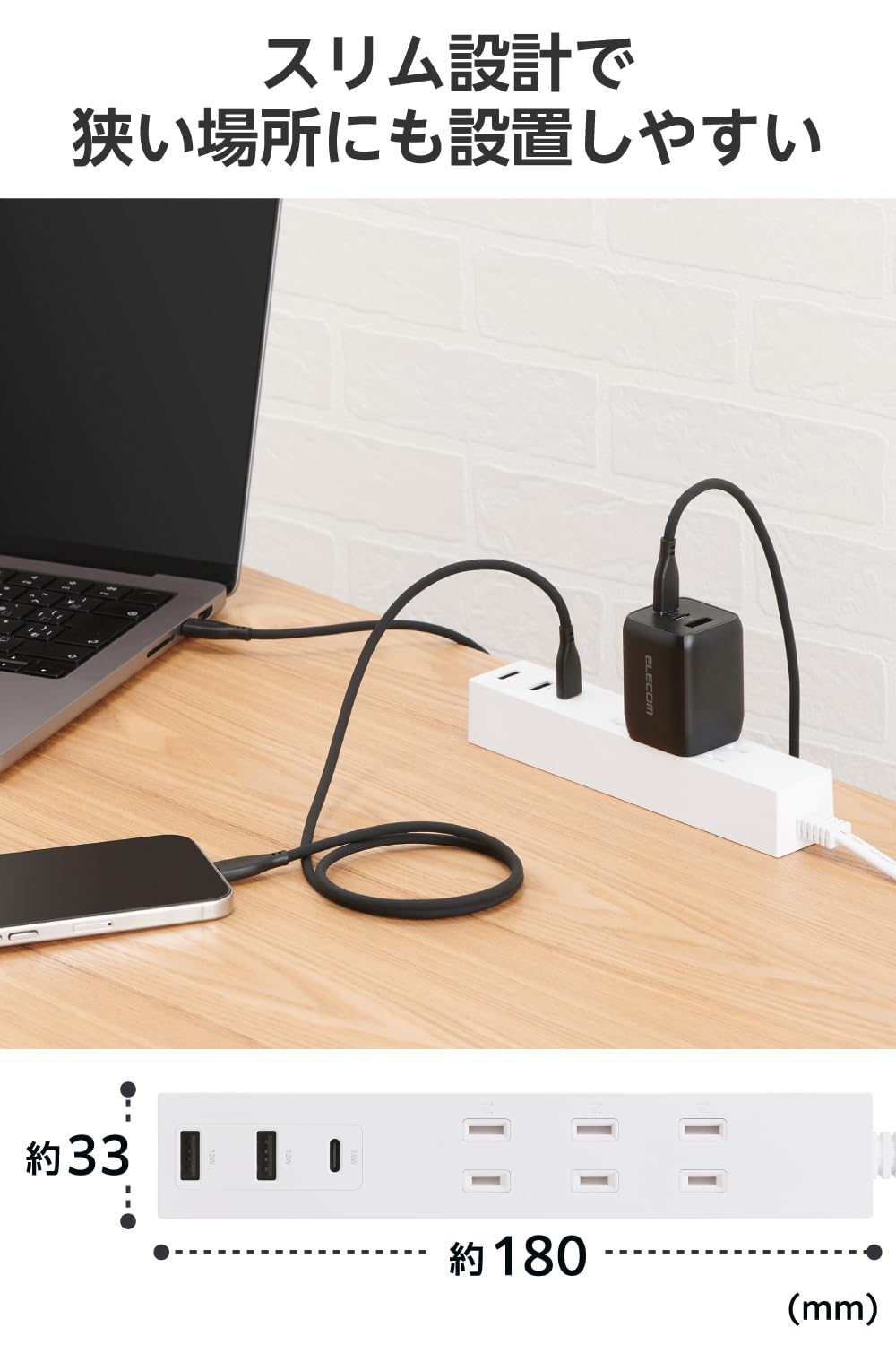 ■ 幅が約33mmのスリム形状なので、机の上など狭い場所に設置しやすく、遠くにあるコンセントやUSB充電器を手元に置くことができます。