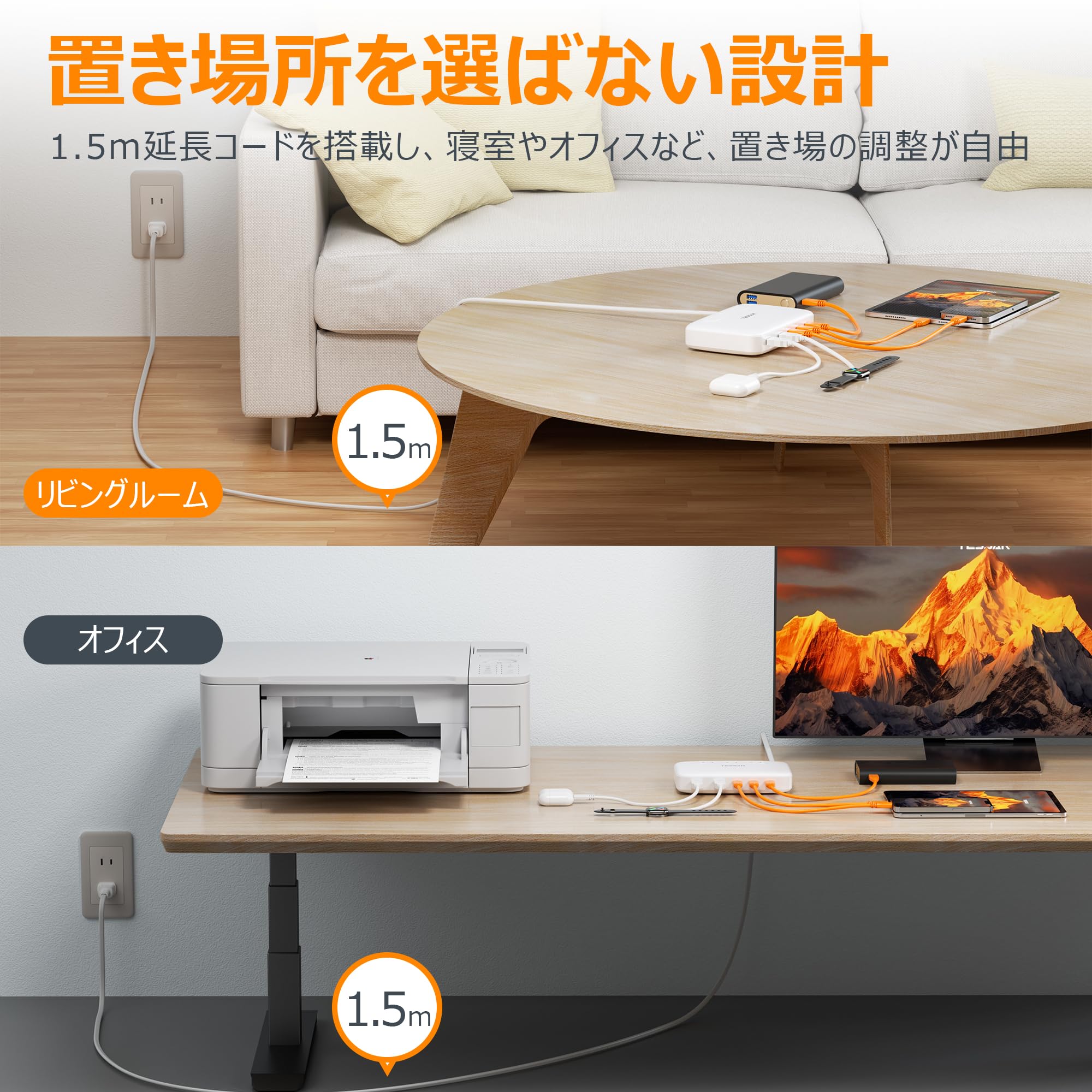 1.5m電源コードが付いているため、固定なところに限らず、自由配置が可能で、デスク周りを保つことができます。