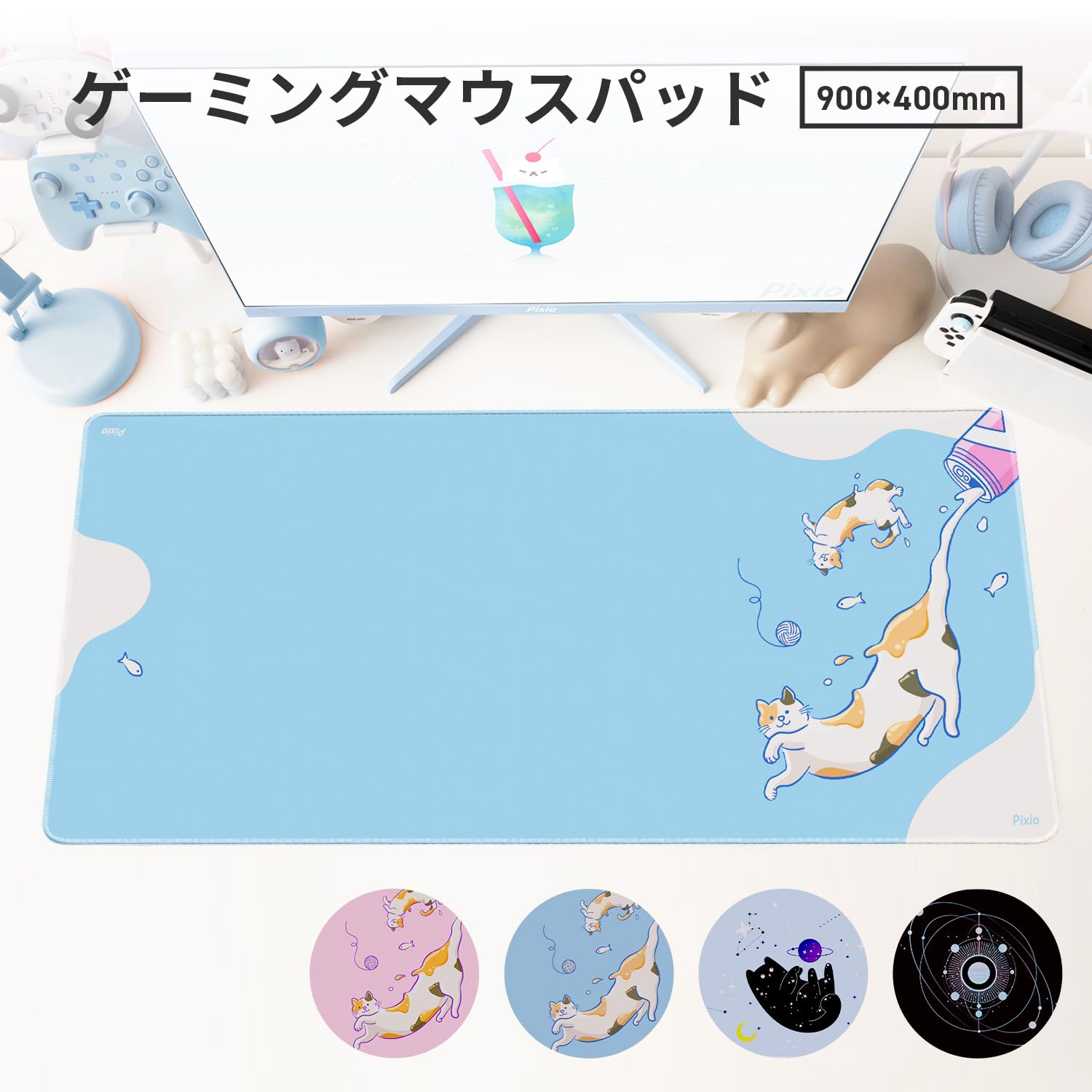Pixio マウスパッド ゲーミング XXL 猫と宇宙 大型 ゲーム 滑り止め ラバー ゴム クロス 表面 キーボードパッド PXMP008XXL