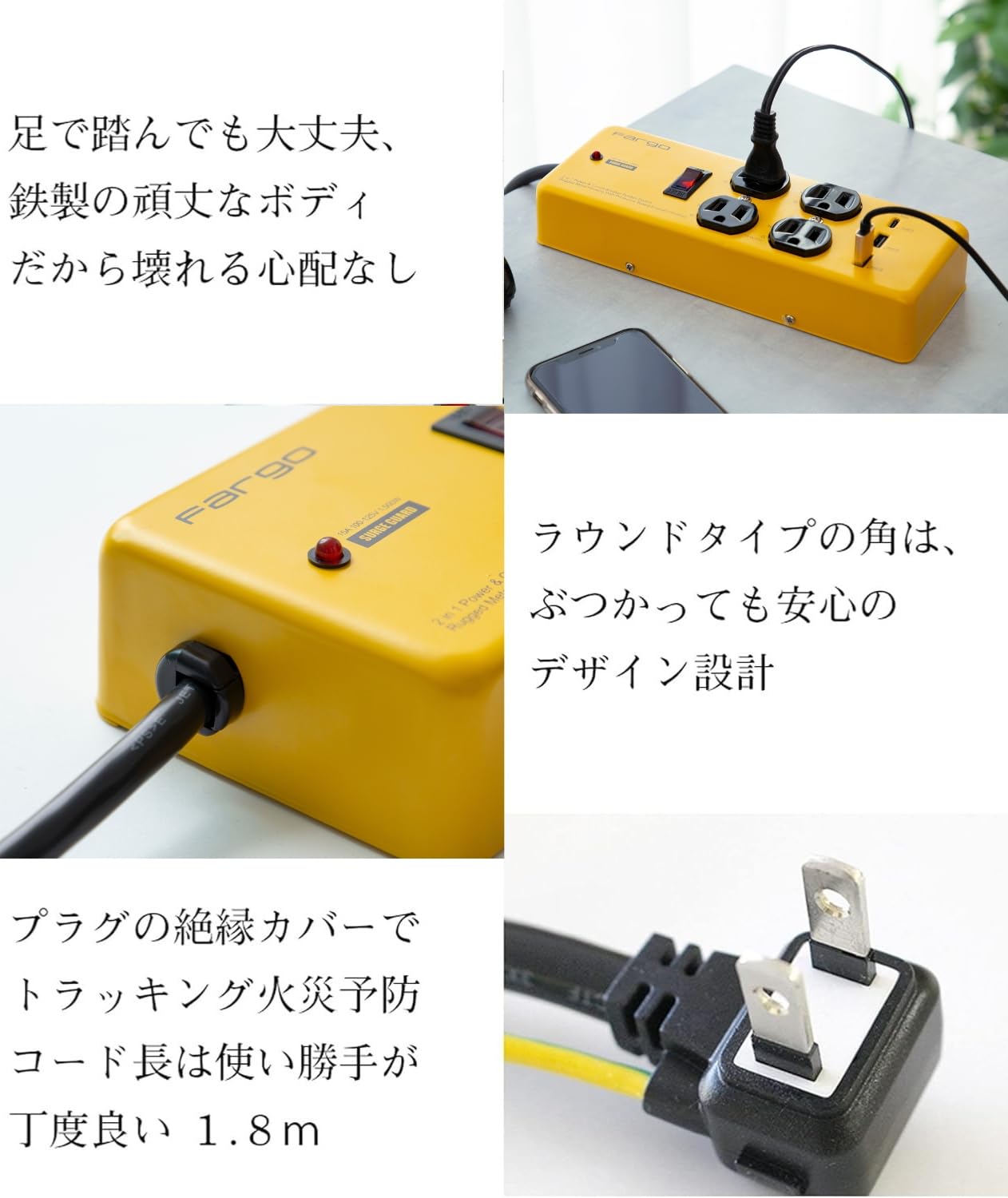 Fargo ファーゴ STEEL TAP 電源タップ スチール製 3ピン対応 アース線付き コード 壁掛け 固定 (イエロー, 4個口 USB付)