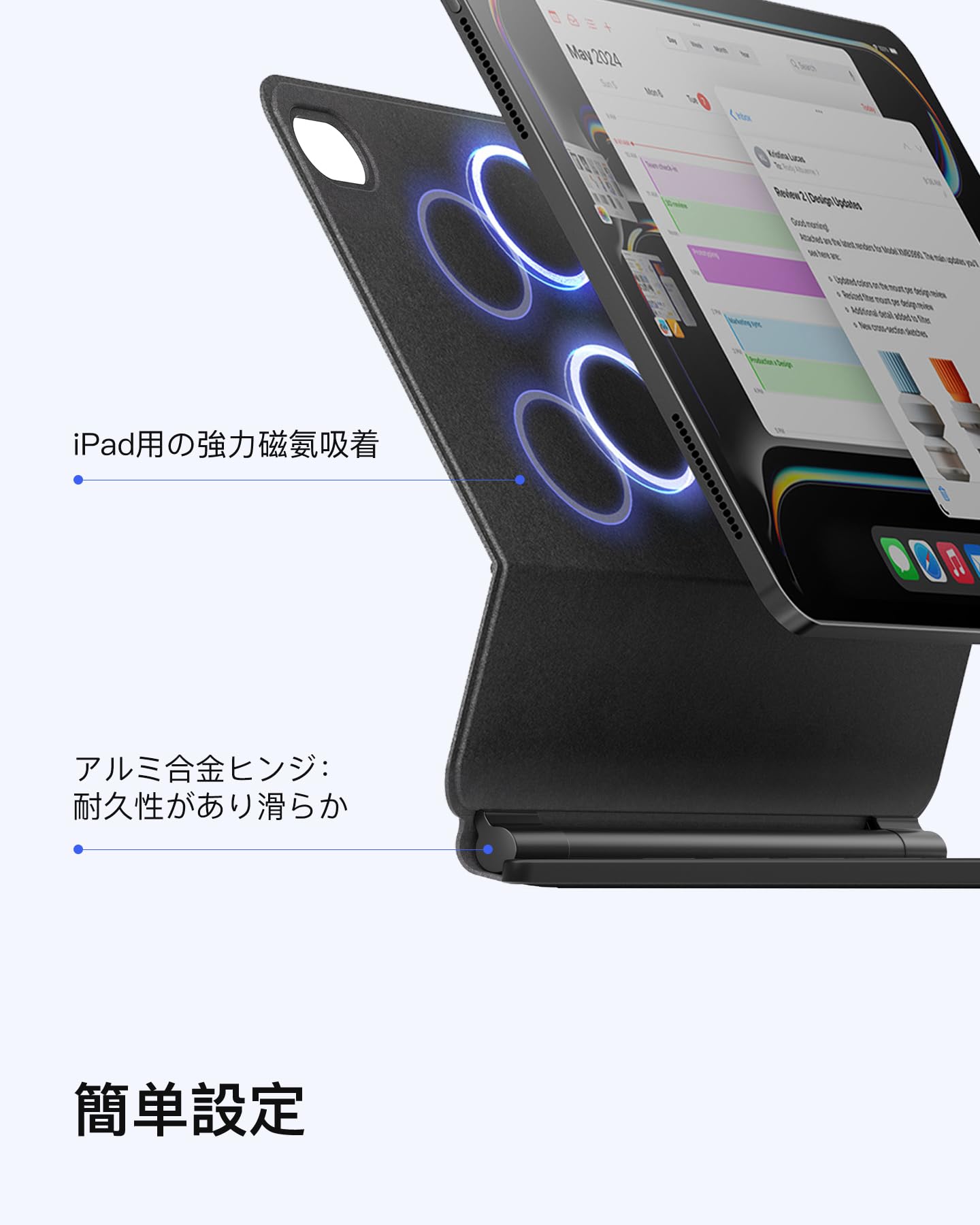■ マグネット式フローティングスタンド: 簡単に磁力で取り付け可能で、iPadをノートパソコンのように変身。
