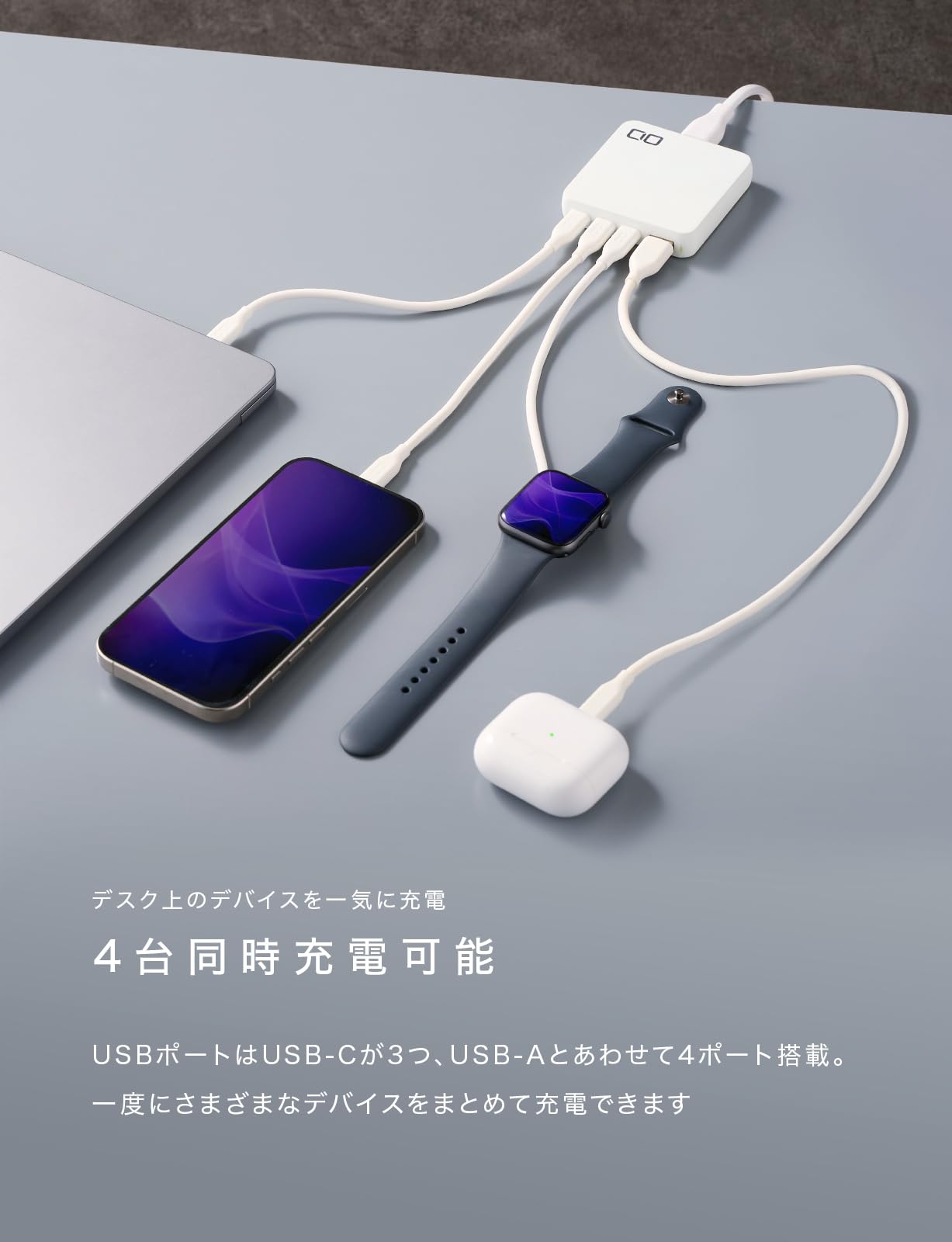 type-C 単ポート最大67W~4ポート合計65Wの高出力を活かした最大4台同時充電に対応し、ノートPC、スマホ、タブレット、ゲーム機、モバイルバッテリー、電子タバコ、ワイヤレスイヤホン、ワイヤレスヘッドセットなど、さまざまなデバイスをこれ1台で充電可能です。
