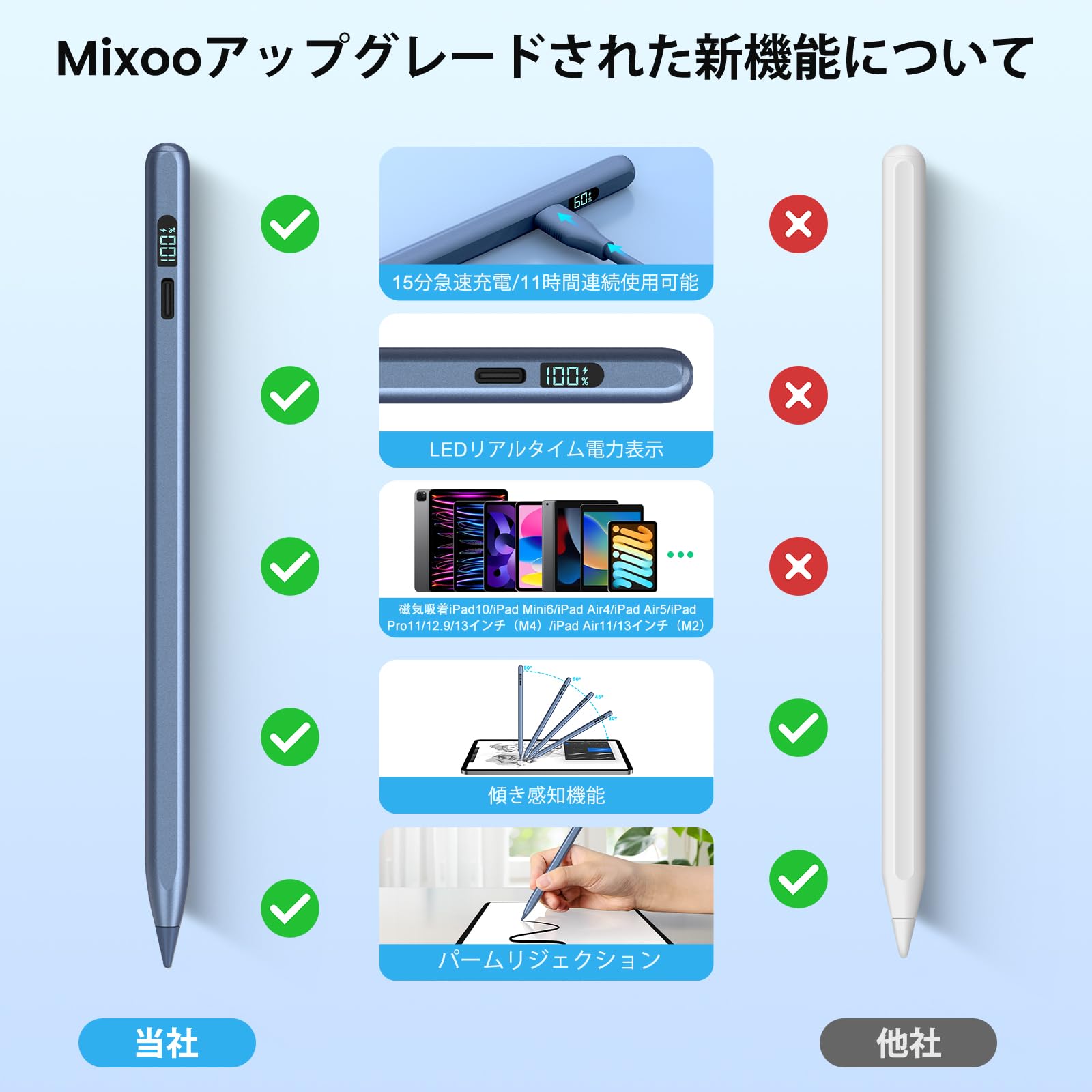 【LED電量表示・15分急速充電】ipadペンシル Mixoo タッチペン Apple Pencil互換 高感度アップルペンシル iPad専用スタイラスペン 極細iPadペン バッテリー残量表示/Type-C充電/傾き感知/磁気吸着/パームリジェクション/自動スリープ 2018年以降のiPad/Pro/Air/mini対応 (ブルー)