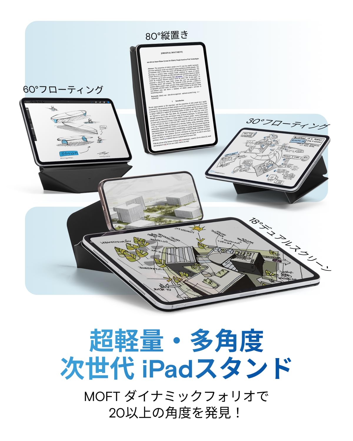 ■ 【縦横自在・20段階以上の角度調整】MOFTの最新作「ダイナミックフォリオ」は、従来のスタンドの概念を覆す次世代のiPadスタンド&ケースです。