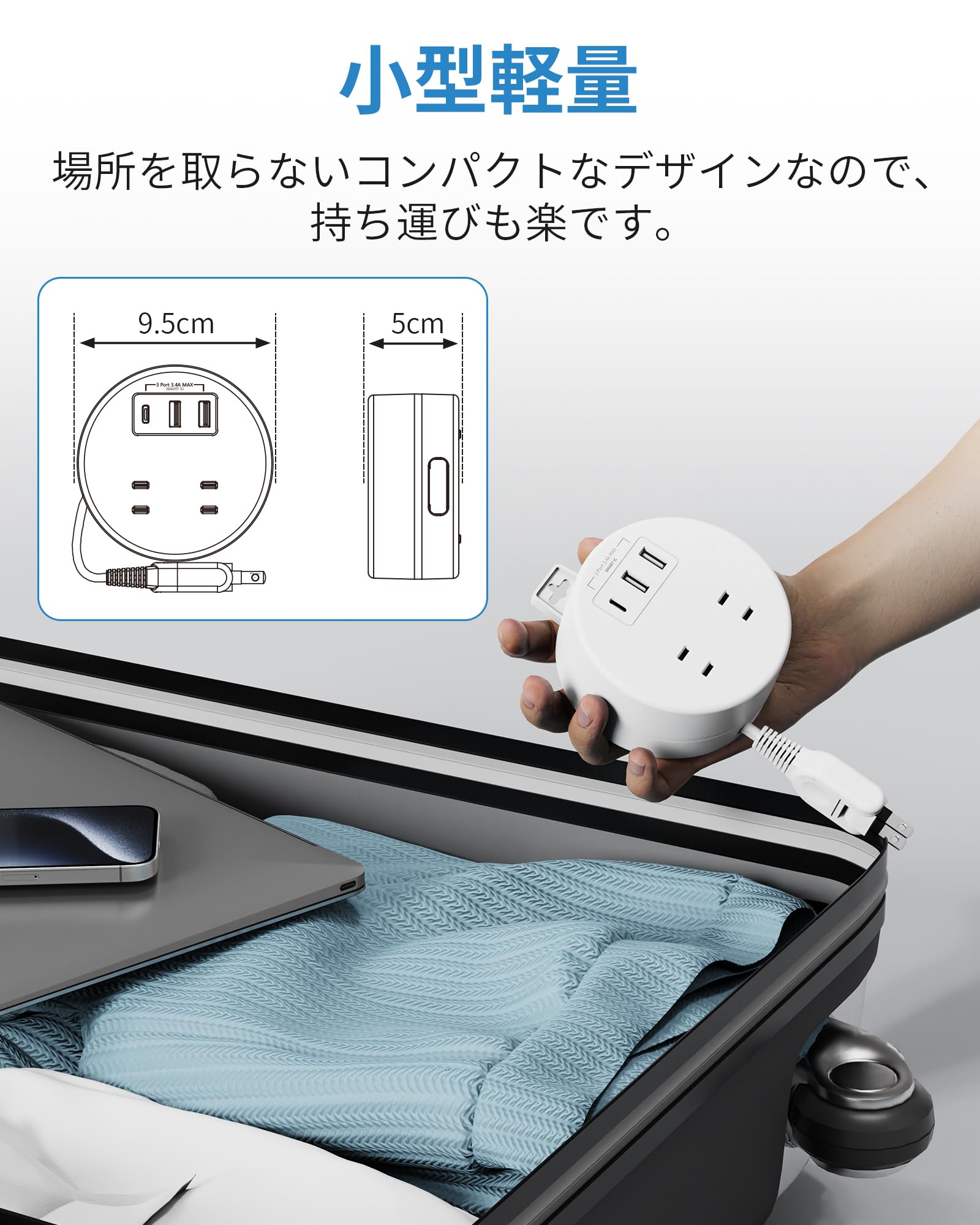 巻き取り式のコンセントは、携帯に便利で、外出時、出張時、旅行時に荷物の中で省スペースです。