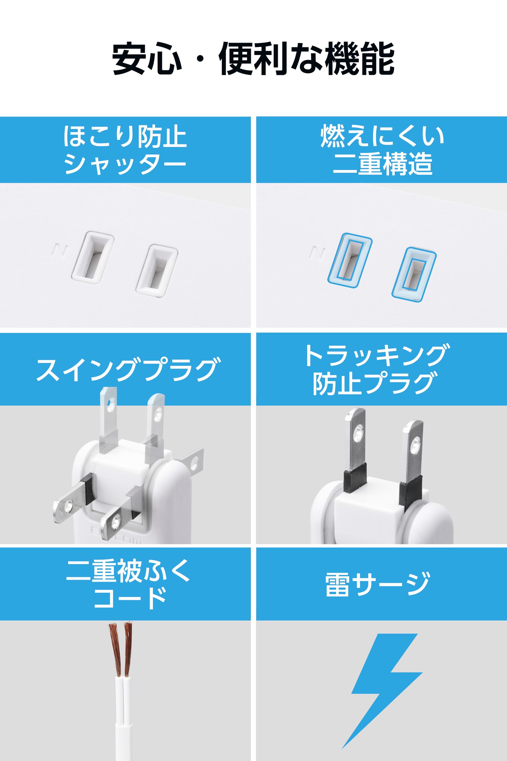 タップにUSBケーブルを直接挿して、ノートパソコンやタブレット、スマートフォンなどを充電できます。