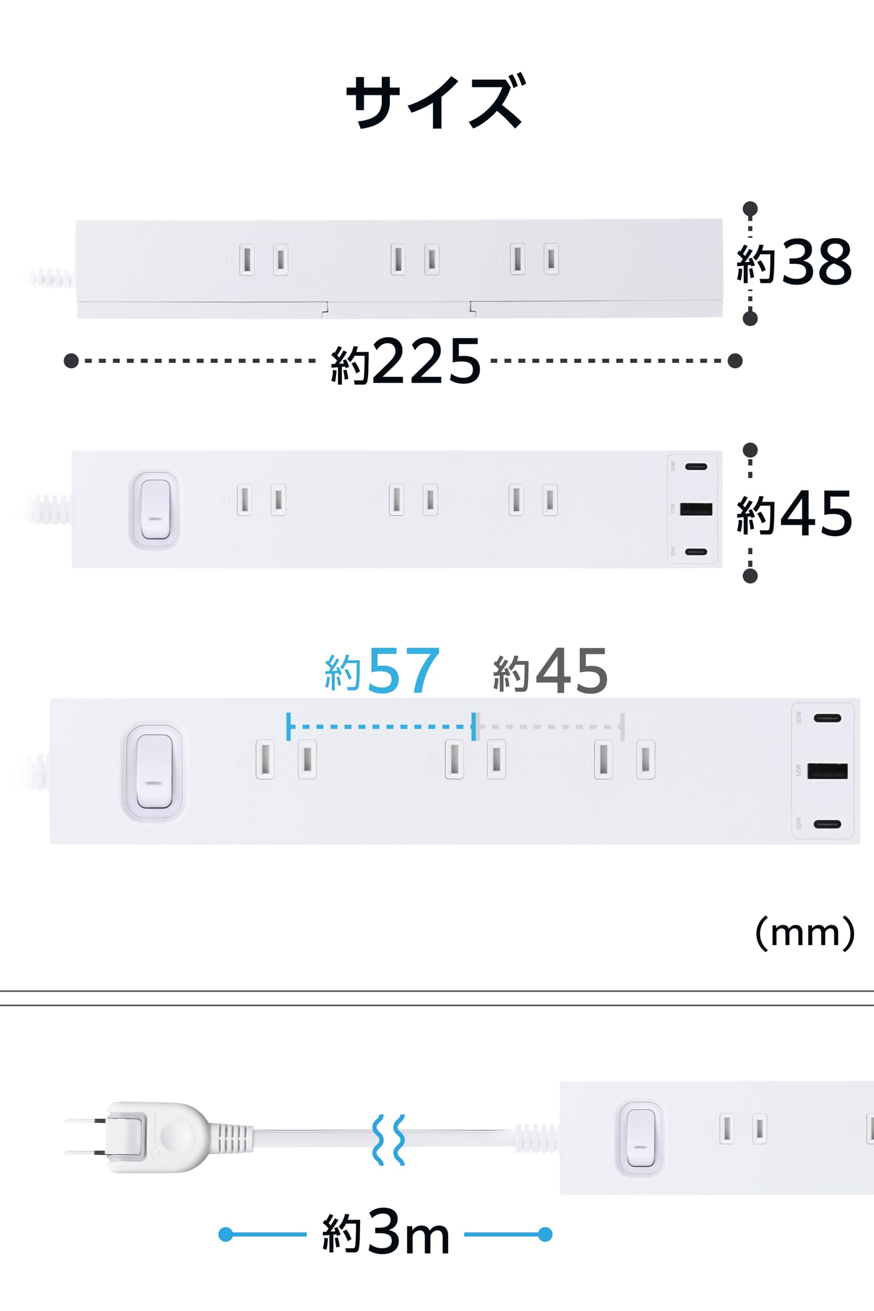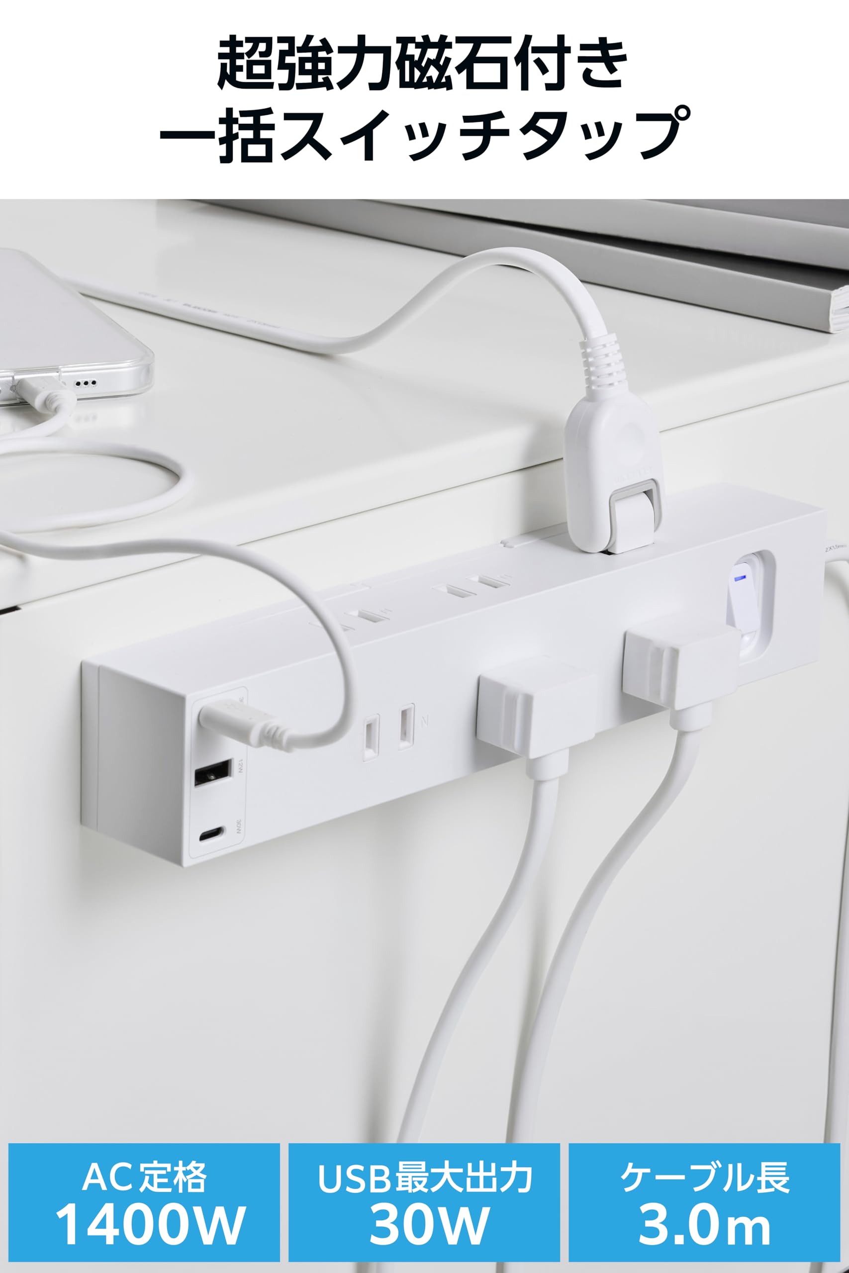 エレコム 電源タップ USBタップ 30W 3ポート Type-C USB-A 6個口 3m 一括スイッチ 回転脚付き 雷ガード付き ホワイト ECT-3930WH
