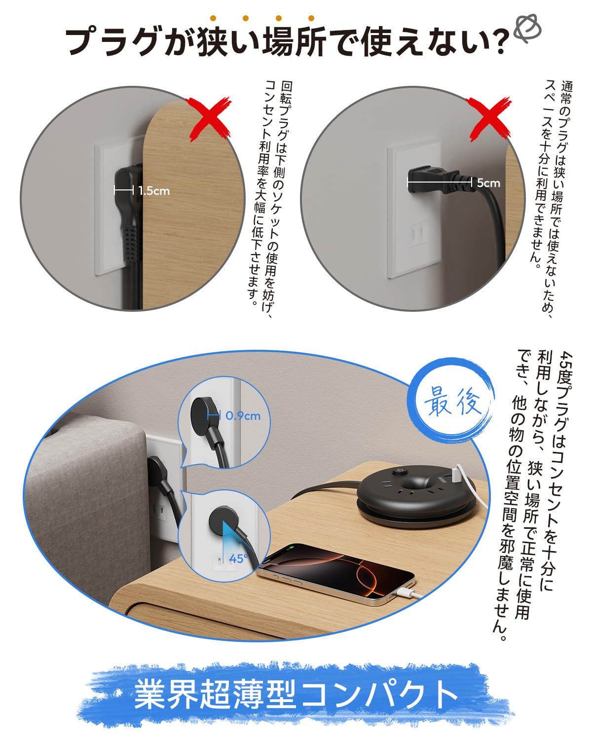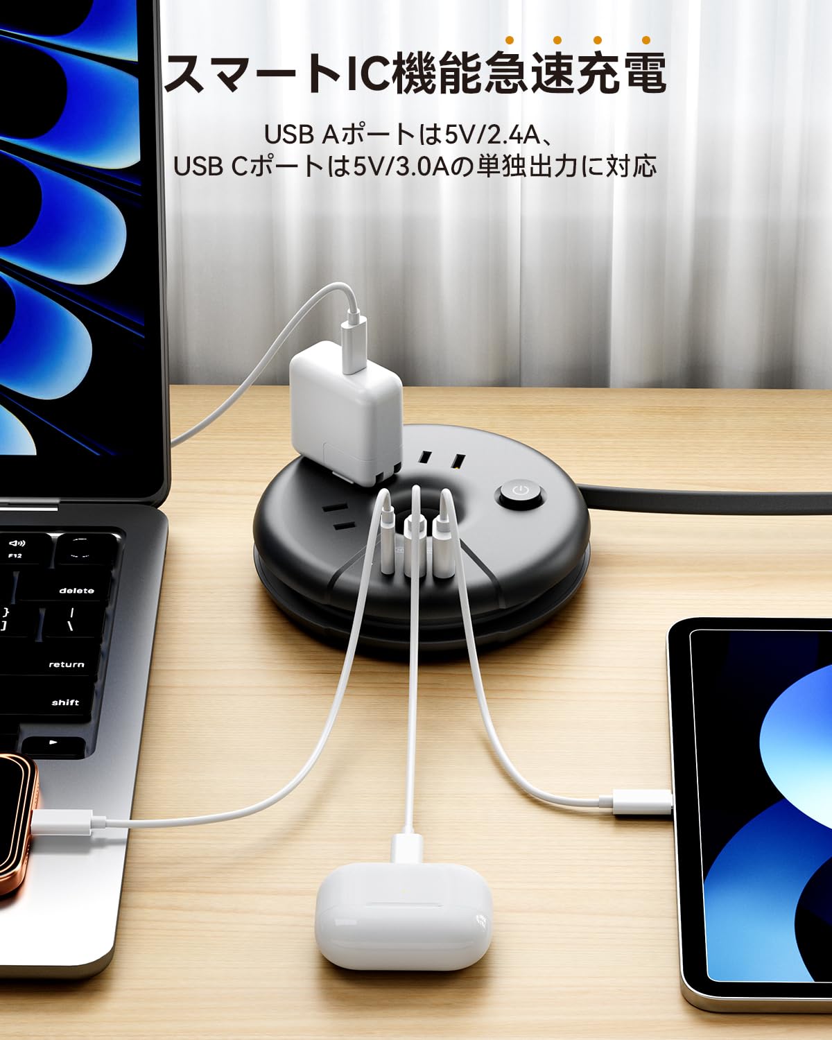 ■ スマートIC機能:コンセントタップはスマートIC機能、USB Aポートは5V/2.4A、USB Cポートは5V/3.0Aの単独出力に対応。