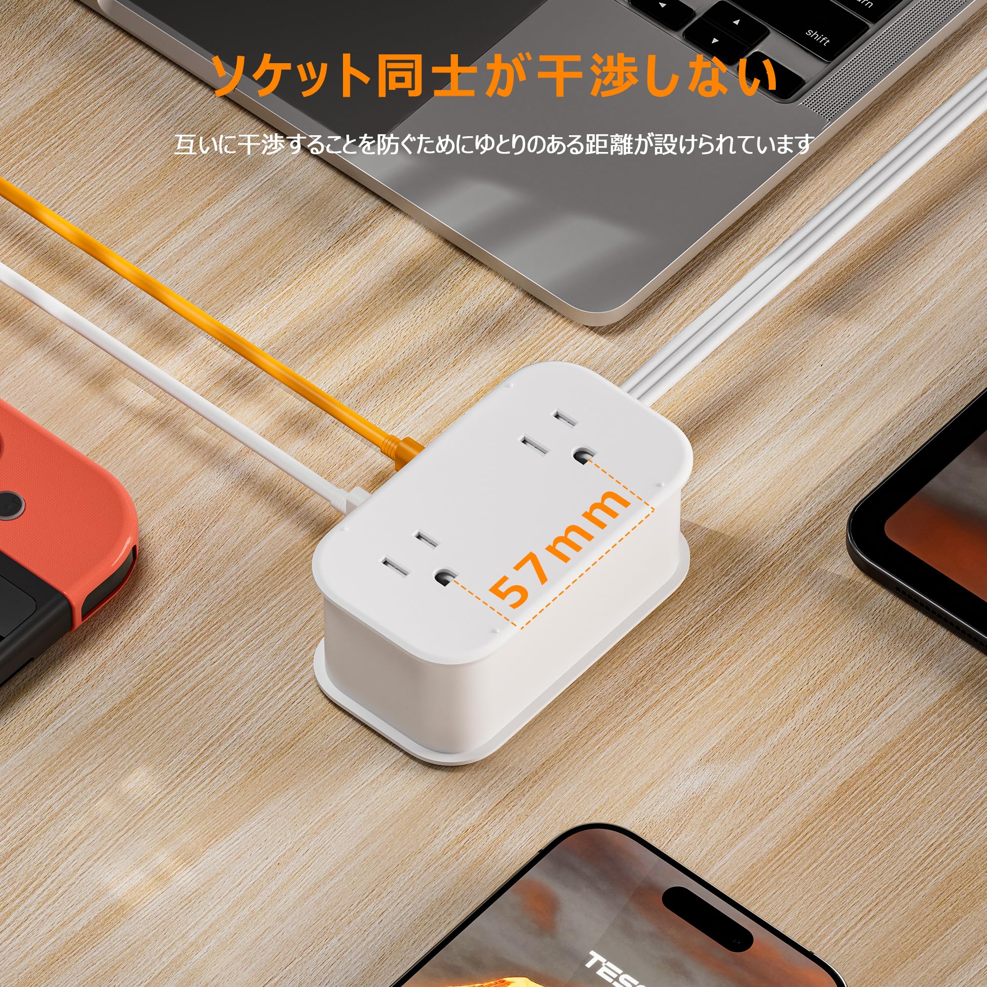 さらに、2つのACコンセント間の距離は0.57センチで大きなACアダプターでも問題ありません。
