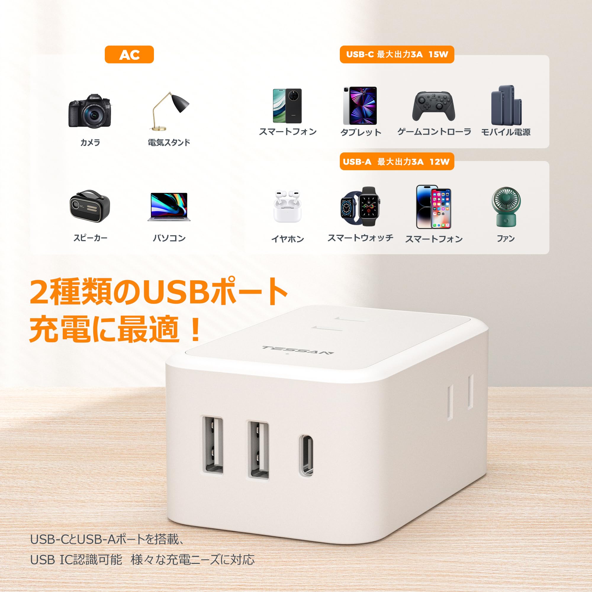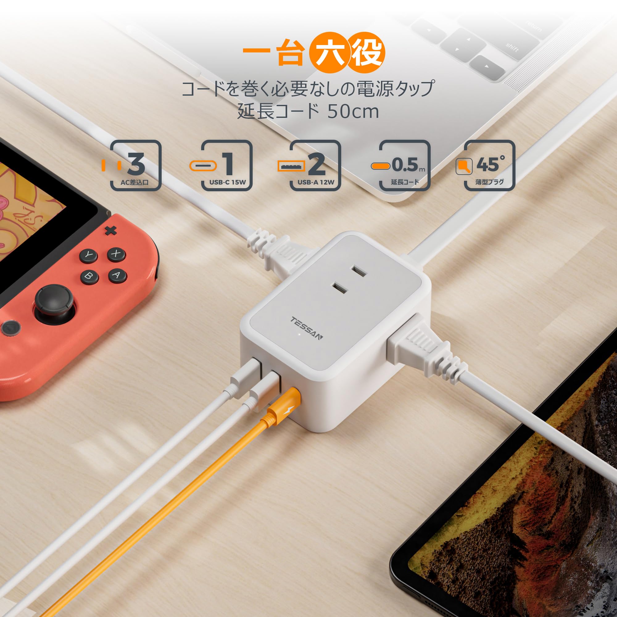 延長コード 0.5m 短い 薄型 電源タップ usb コンセント たこあしコンセント テーブルタップ TESSAN 3個AC 1個タイプC 2個タイプA 電源コード oa type-c タコ足配線 蛸足 隙間