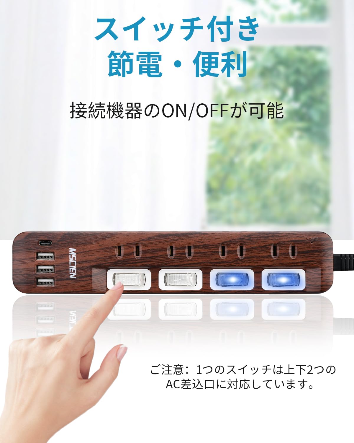 Mscien エムサイン 延長コード 3m 電源タップ usb付き コンセント 雷ガード usb-c マルチ スイッチ たこあし分岐 oaタップ テーブルタップ スイングプラグ 壁掛け 木目調 ウォルナット