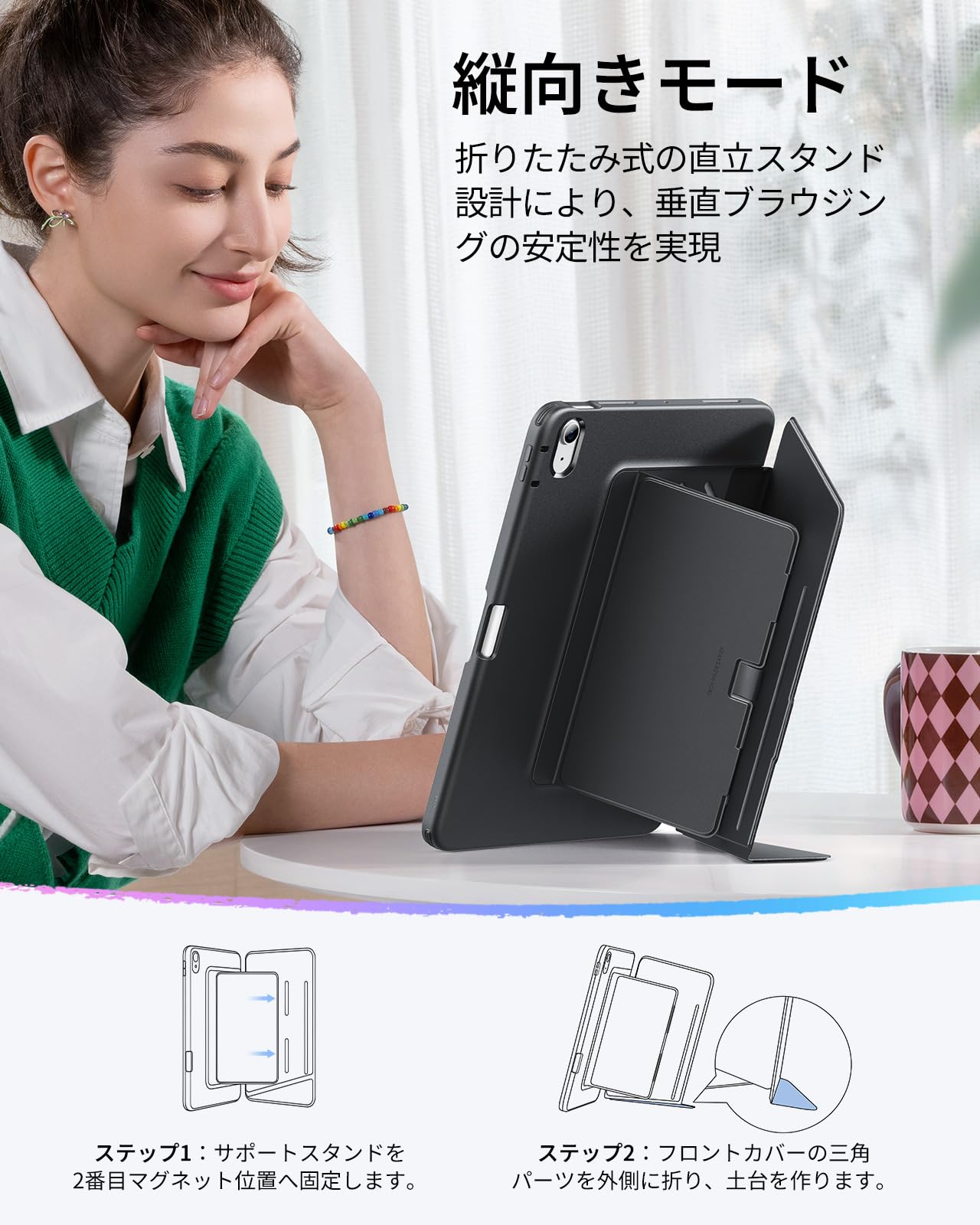 縦向き利用時は2番目のマグネット位置へ固定し、フロントカバーの小さな三角パーツを外側に折ることでしっかりと自立します(内側に広げて使用しないでください)。