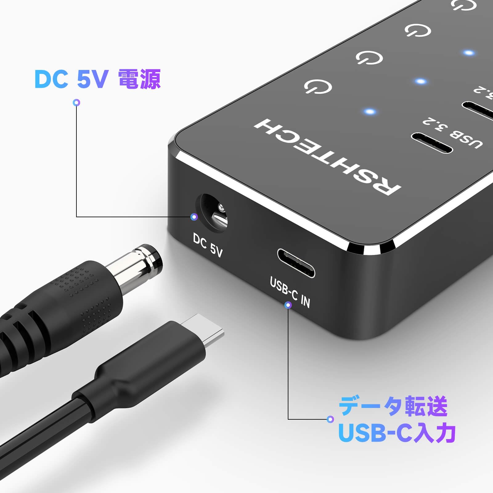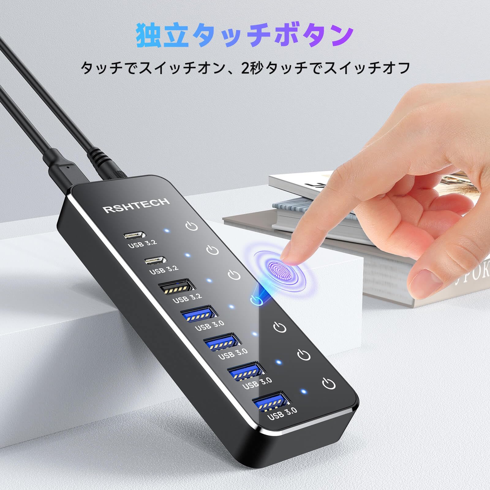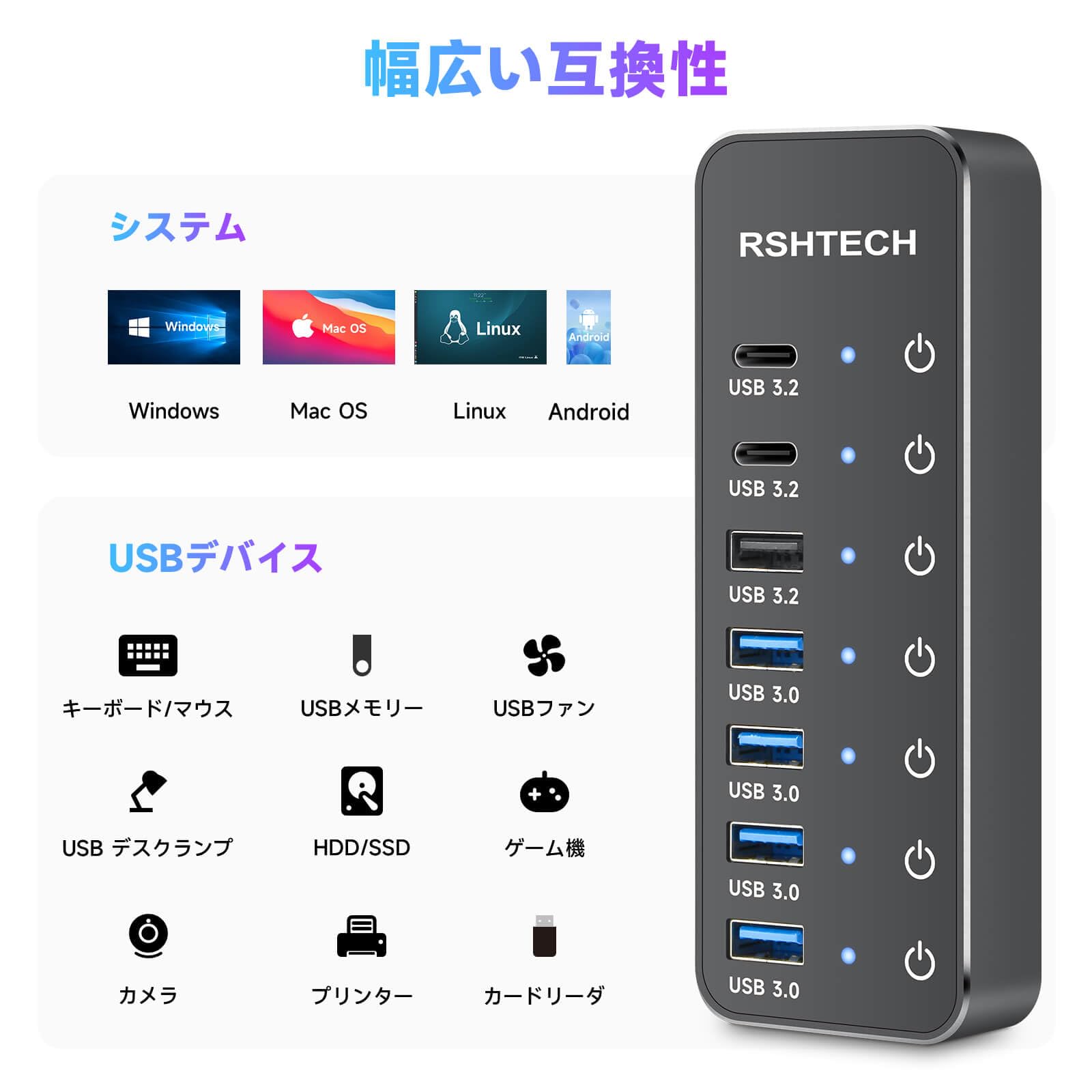 RSHTECH USB ハブ10Gbps 7ポートUSB C 3.2x2 USB A 3.2x1 USB 3.0x4 2 in 1 ケーブル 付き アルミ製 USB HUB セルフパワーとバスパワー両用 5V 電源 独立スイッチ付き(RSH-ST07C)