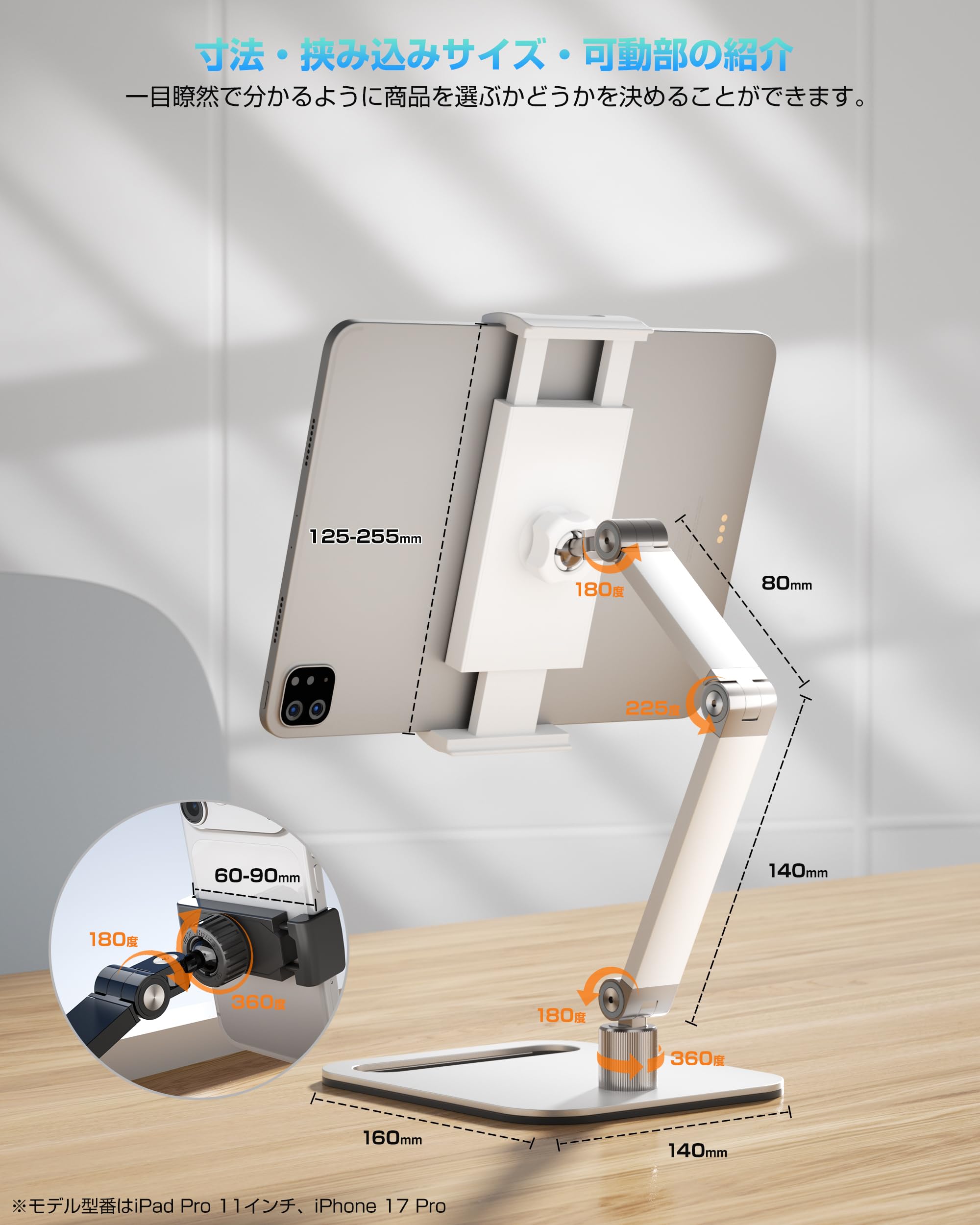 ■ 【4.7-17.3インチ幅広く対応】スマホホルダーとタブレットホルダーが付きますが、大画面用クリップホルダー部の長さを125-255mmまで伸縮することができ、4.7-17.3インチのほとんどのスマートフォン、タブレット、モバイルモニターに対応可能です。