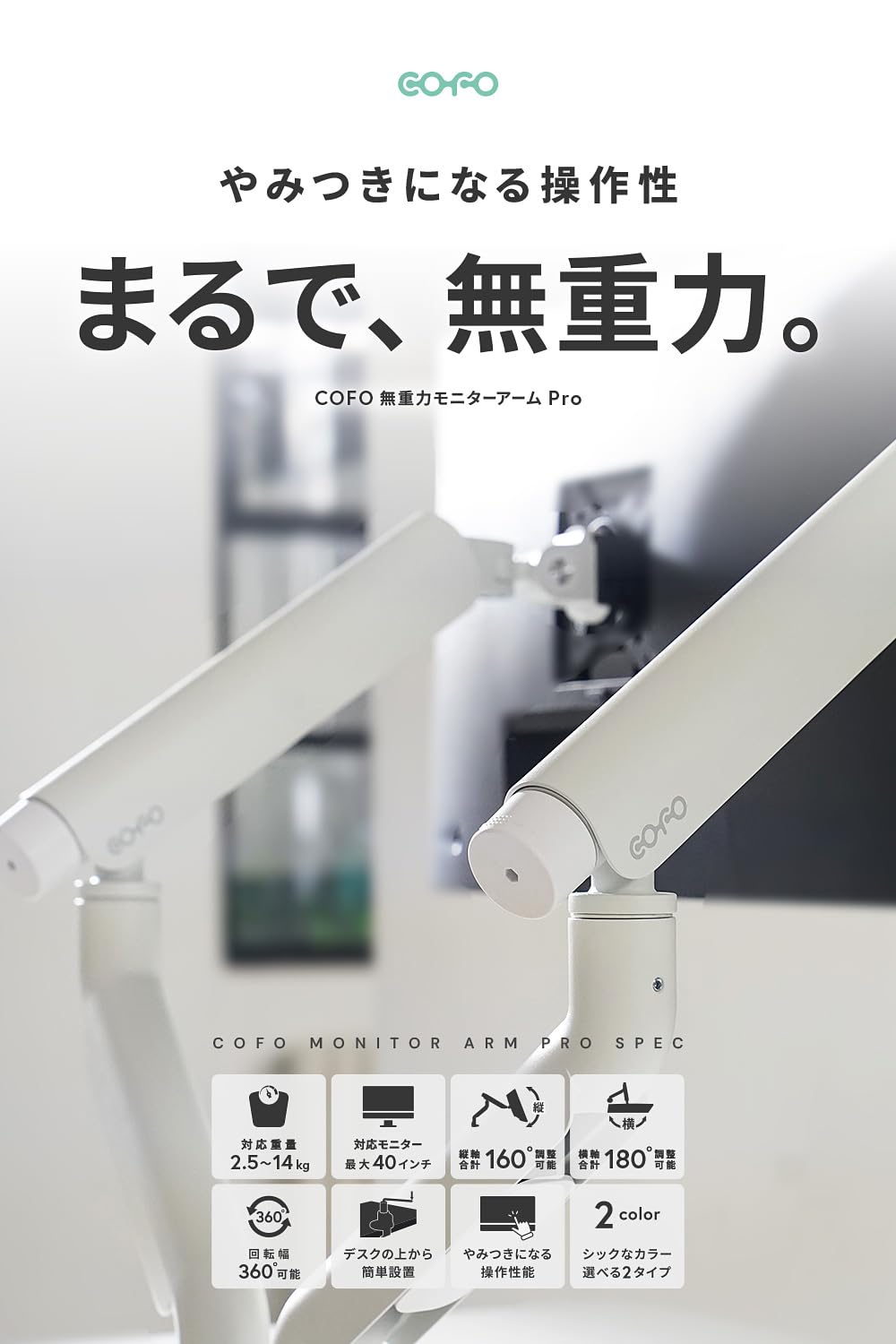 COFO 無重力モニターアーム Pro デュアル 17〜40インチ、2.5〜14kg対応 角度/高さ調整可能 ダブルメカニカルスプリング式 デスク設置用 スチール アルミ合金製 2画面 (ホワイト)
