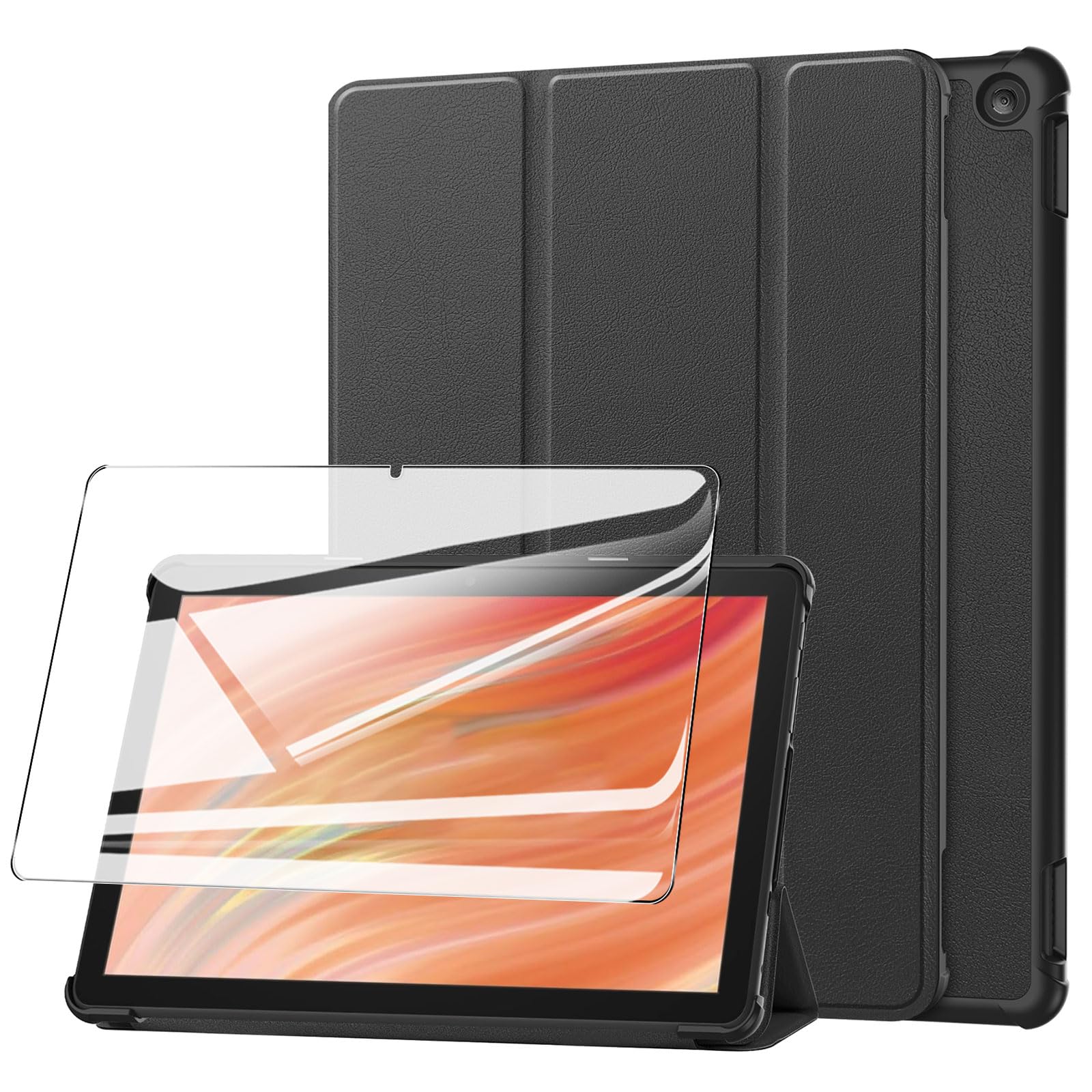 For HD 10 ケース 保護フィルム セット HD 10 タブレット 10インチ 用 保護ケース ガラスフィルム 軽量 保護カバー 角度調整 上質PU製 汚れ防止 全方位保護 耐衝撃 【ブラック】+保護フィルム1枚