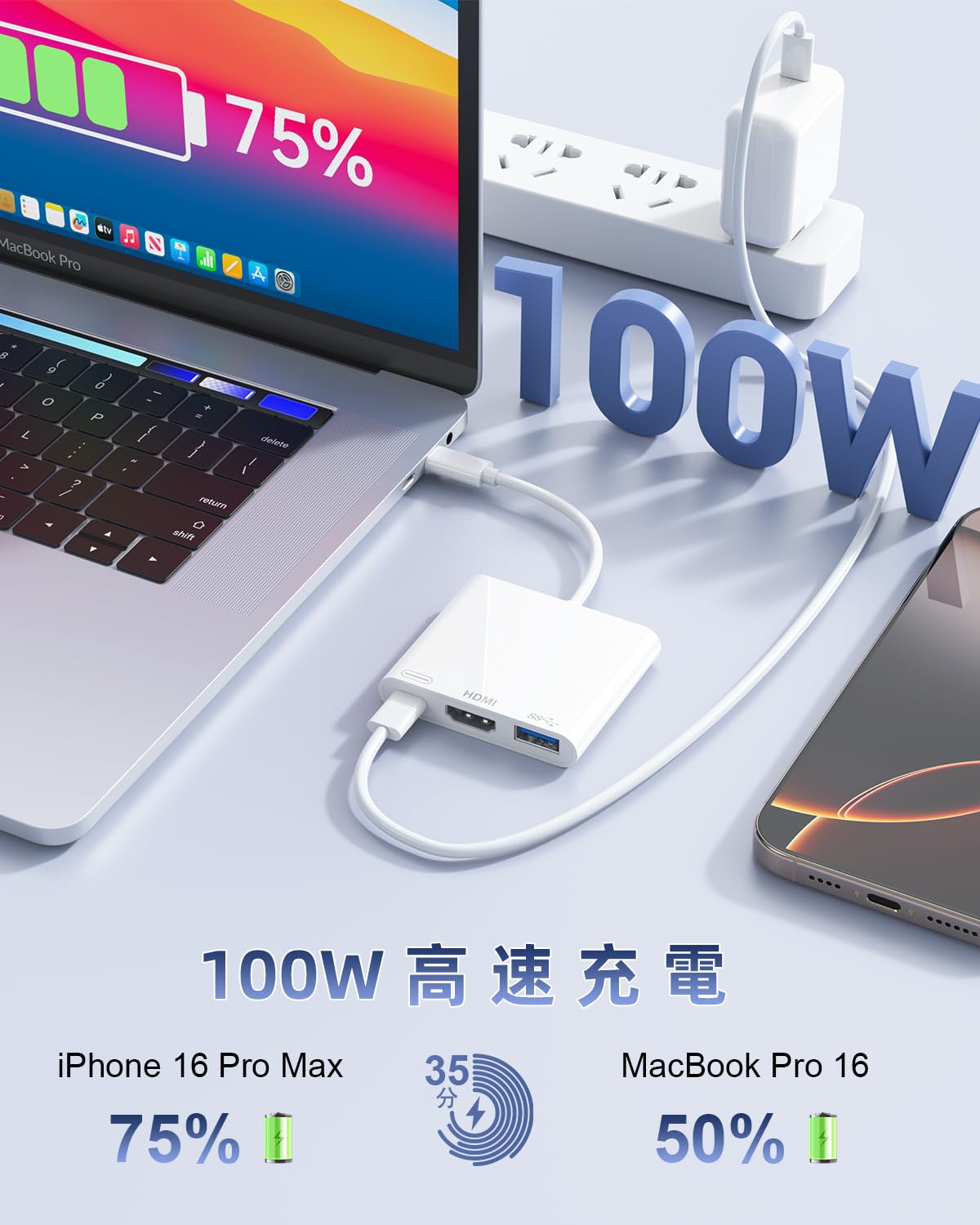 【2025新モデル】USB-C HDMI 変換アダプタ 3in1|4K@60Hz映像出力 / USB3.0高速転送 / PD100W急速充電|iPhone 17/16/15・MacBook・iPad Pro・Samsung・SwitchなどUSB-C機器対応