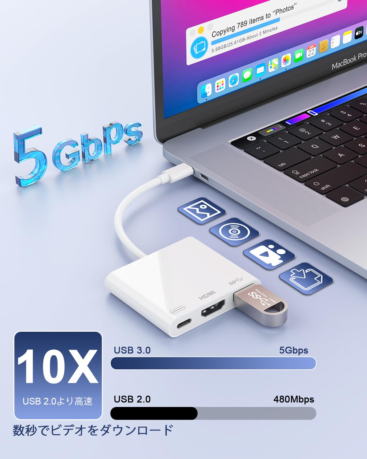 ■ 【5Gbps高速データ転送&幅広い互換性】 タイプC HDMI 変換アダプタのUSB3.0ポートは最大5Gbpsの高速データ転送に対応し、1GBの動画ファイルもわずか数秒で転送可能。