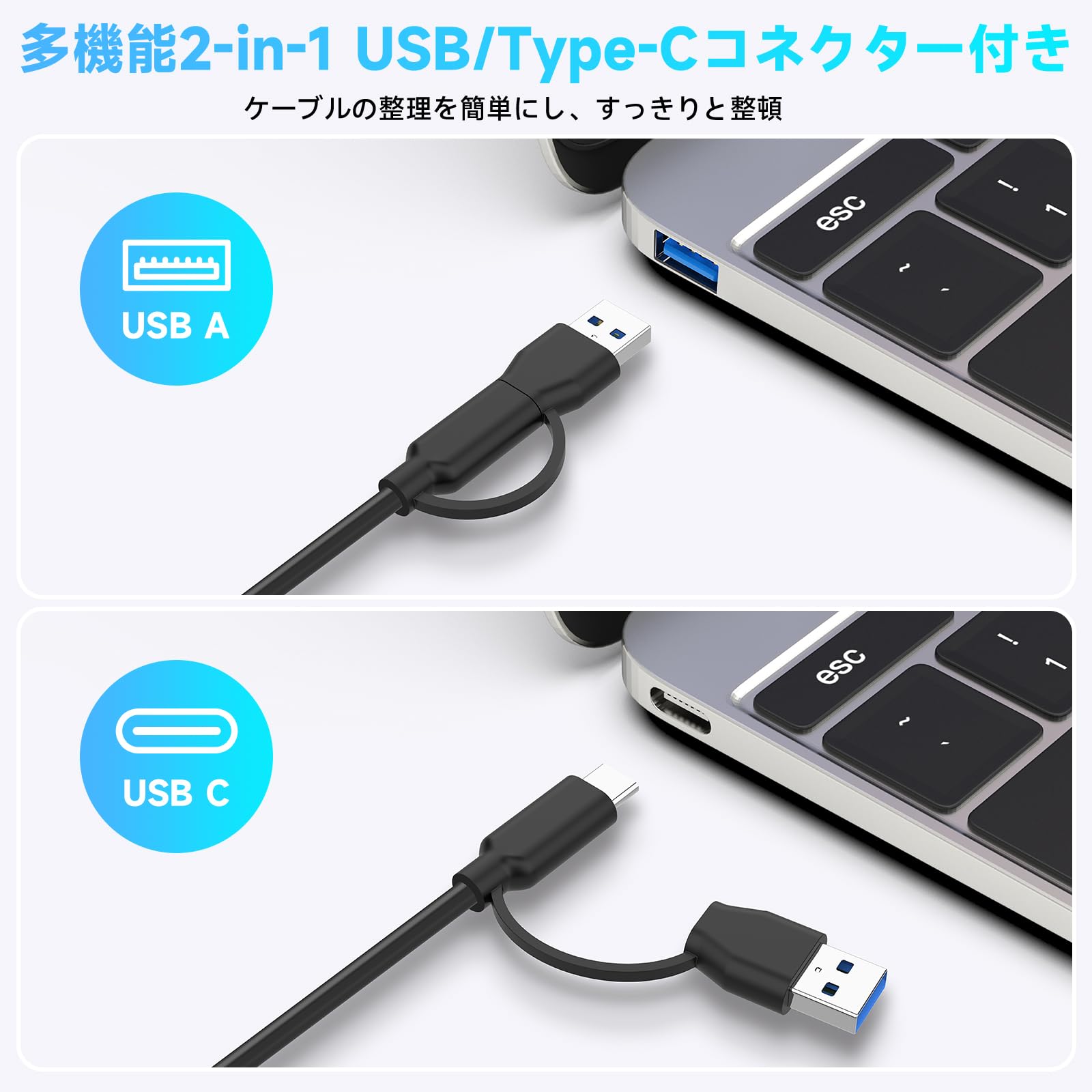 ■ 【USB&TYPE-C 2種のコネクタ対応】付属の2in1ケーブル(USB C + USB A to USB C)で、各種(USB C/Thunderbolt3)機器の接続が可能です。