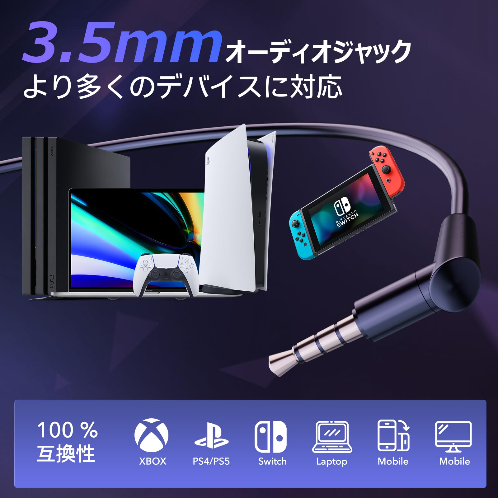 有線イヤホン マイク付き対応機器は、Switch / PS4 / PS5 / スマートフォン / タブレットPC / PC / Xbox One / MacBookなど多岐にわたります。