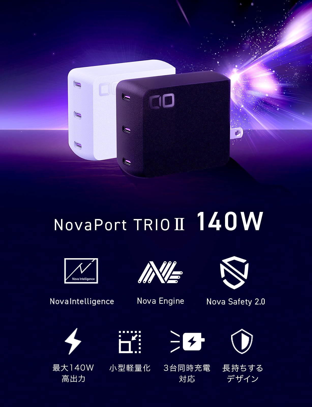 CIO NovaPort TRIOⅡ 140W PD3.1 3ポート 急速充電器 [世界最小級 CIO独自技術 NovaIntelligence NovaEngine搭載] USB-C×3 ACアダプター コンセント 軽量 Macbook Pro Windows iPhone 17 / Air / 16 / 15 Android Galaxy iPad ノートPC (ブラック)