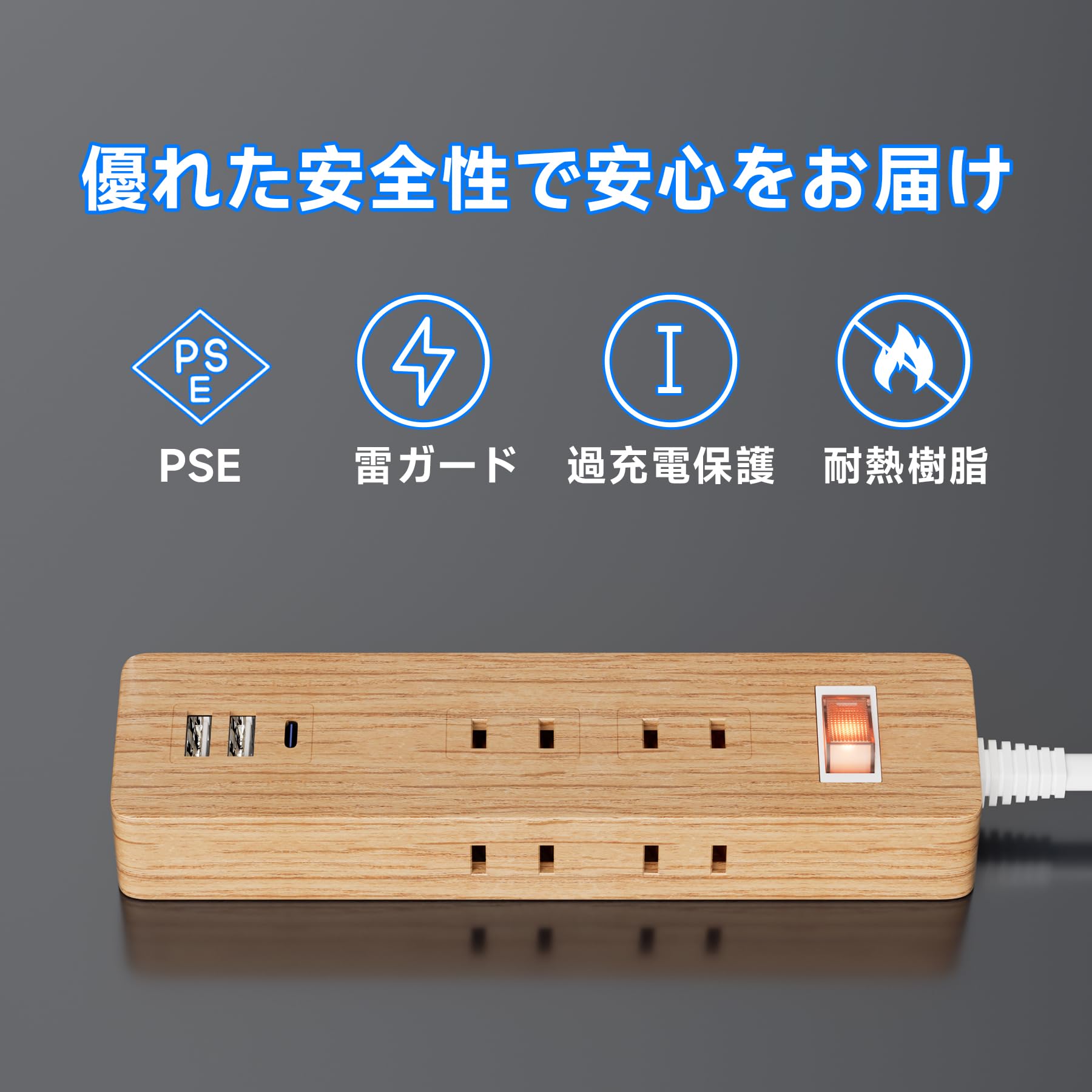 絶縁カバーや二重被覆コード・耐熱難燃性ボディなどを採用し、火災感電のリスクを低減。