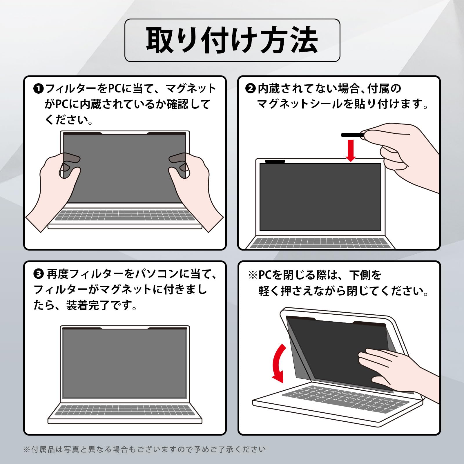 また、固定用のタブや両面テープも付属していますが、こちらも必要な時のみお使いください)※フィルターを装着したままPCのカバーを閉じると僅かに隙間が生じる機種もございますが、スリープ機能は問題なく作動します。