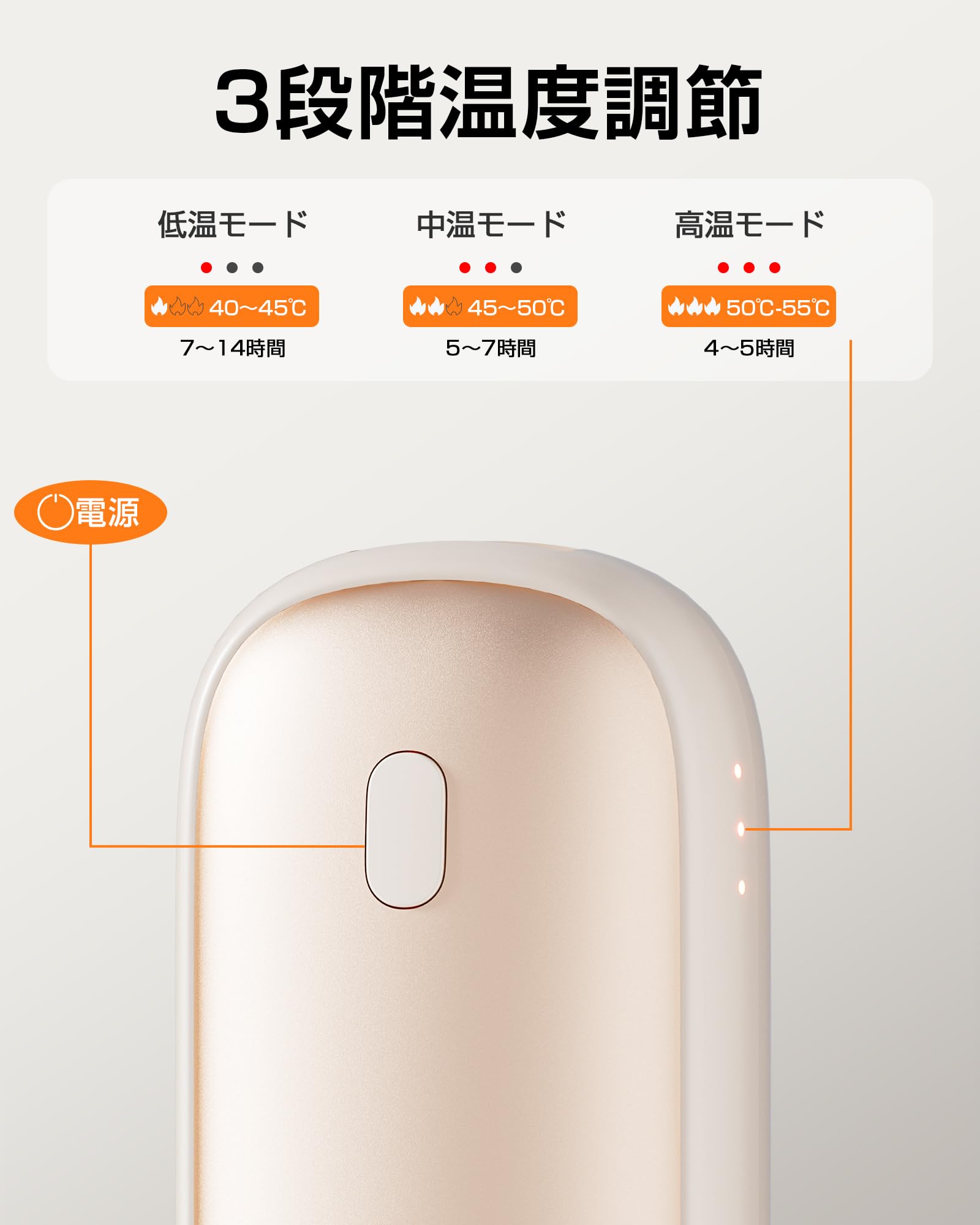 長時間の使用にも耐え、低温モードで7-14時間、中温モードで5-7時間、高温モードで4-5時間。