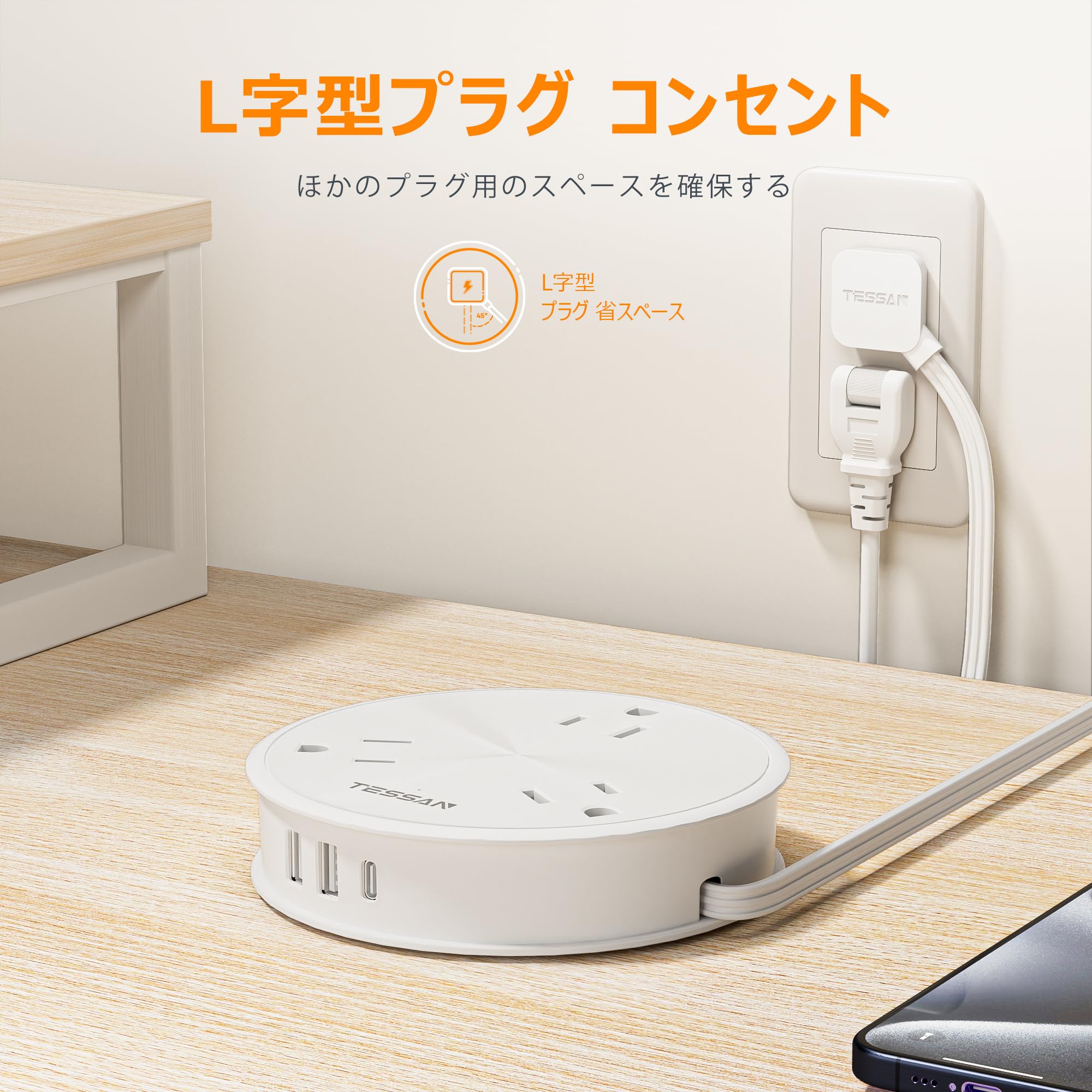 ■ 【L字型プラグ コンセント付き】このテーブルタップは薄型プラグを採用しており、厚さはわずか0.8cmと一般的なプラグよりも薄くて、狭いスペースでの使用にも最適です。