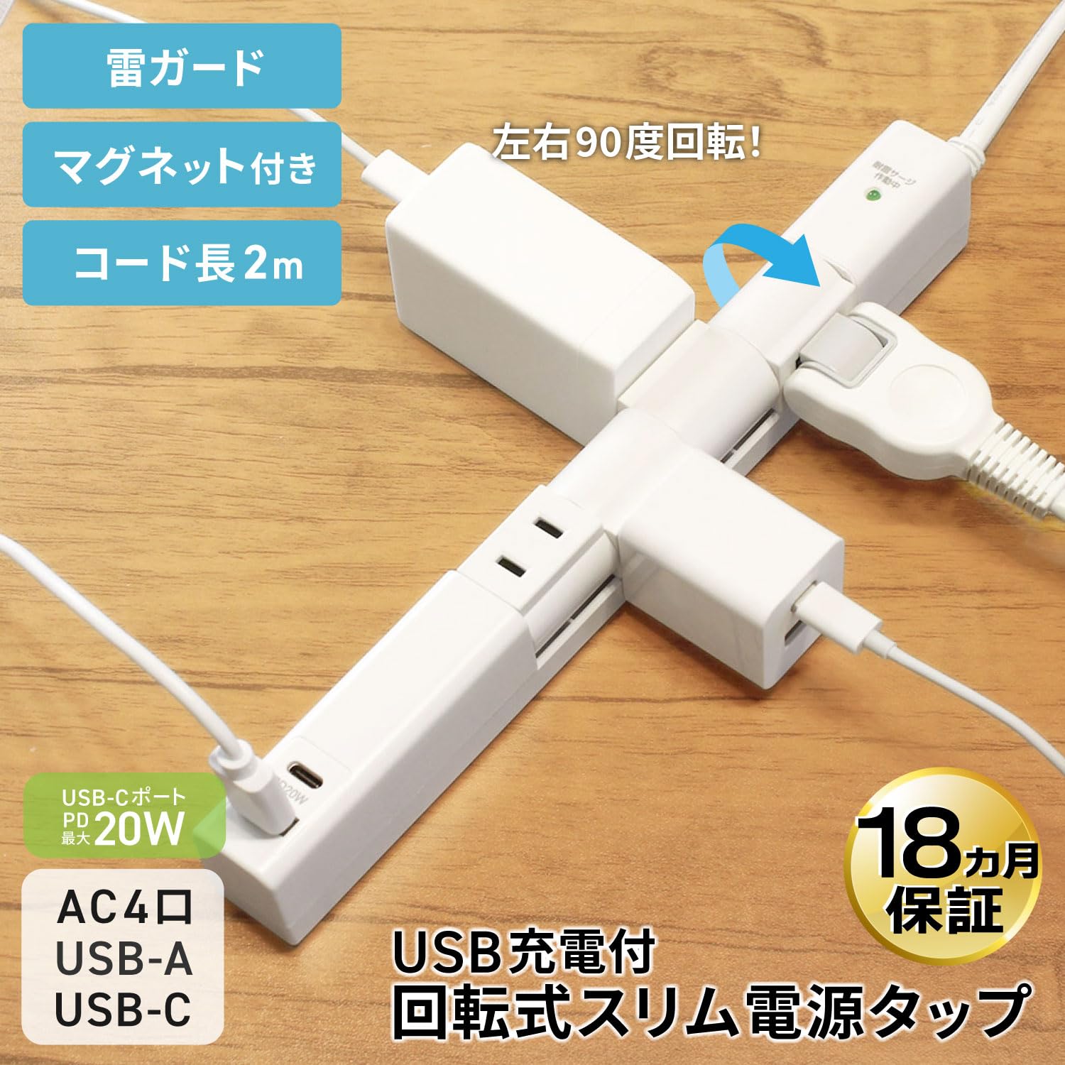 STYLED 回転式 マグネット付き PD20W USB付き 電源タップ ACコンセント 4口 2m ホワイト 延長コード 回転タップ 雷ガード OAタップ 18ヵ月保証 1400W (AC×4口+USB(PD20W)充電付)