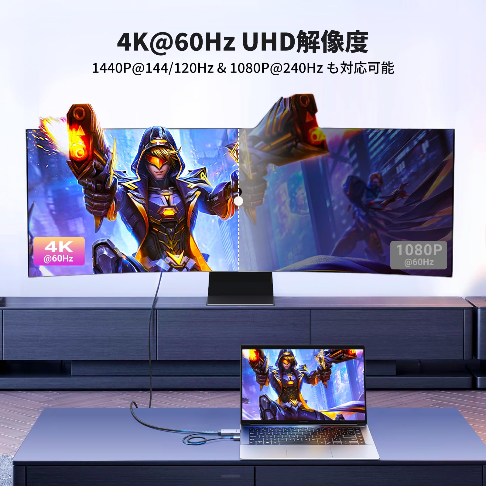 ご注意:4K@60Hz出力を達するには、お使いの機種とモニターは両方とも4K@60Hzの解像度を応できる必要があります。