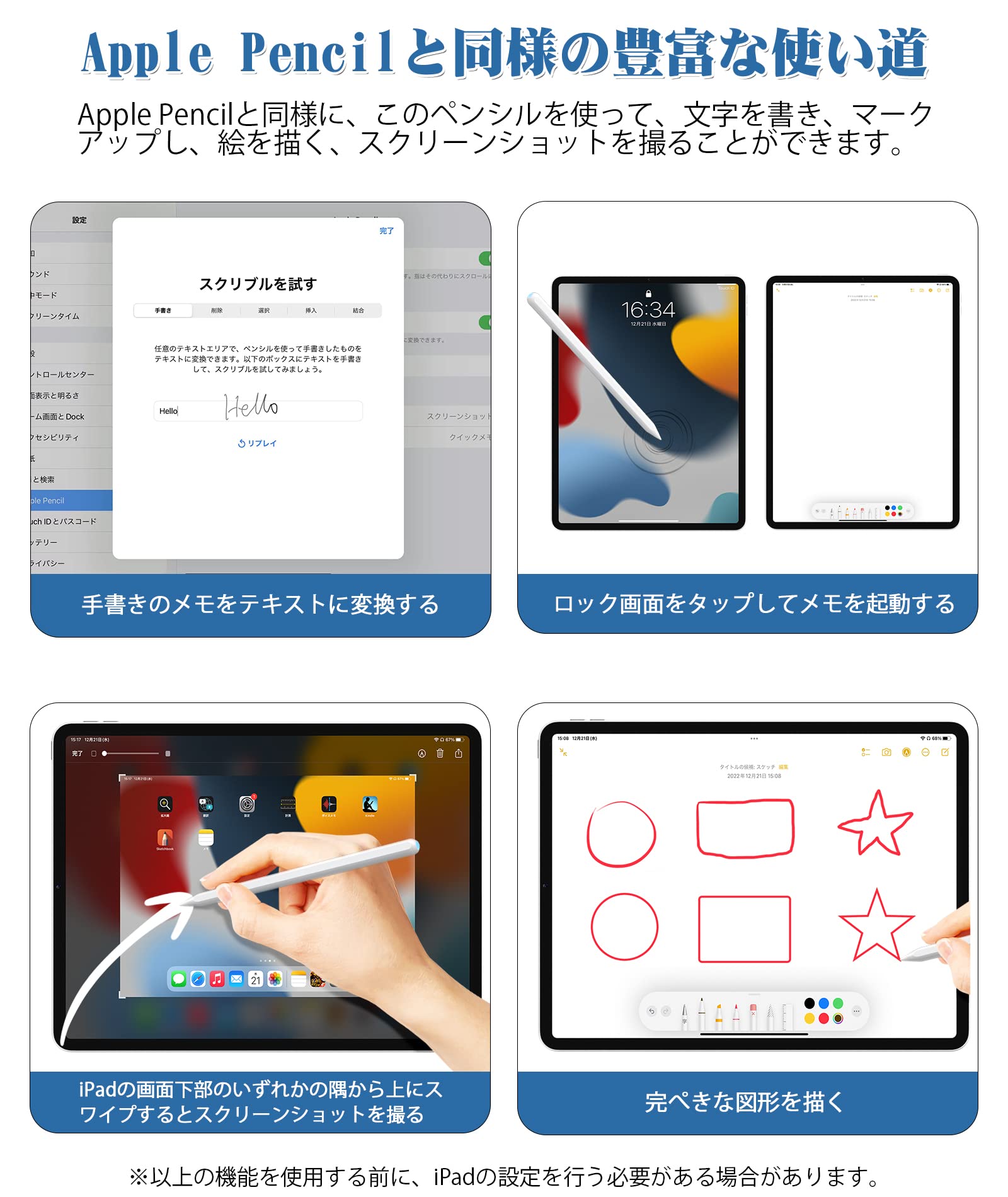 また、iPadのロック画面からメモを起動すること、スクリーンショットを撮ること、スクリブル機能、図形補正などのアップルペンシルが持つ機能にもサポートしています。