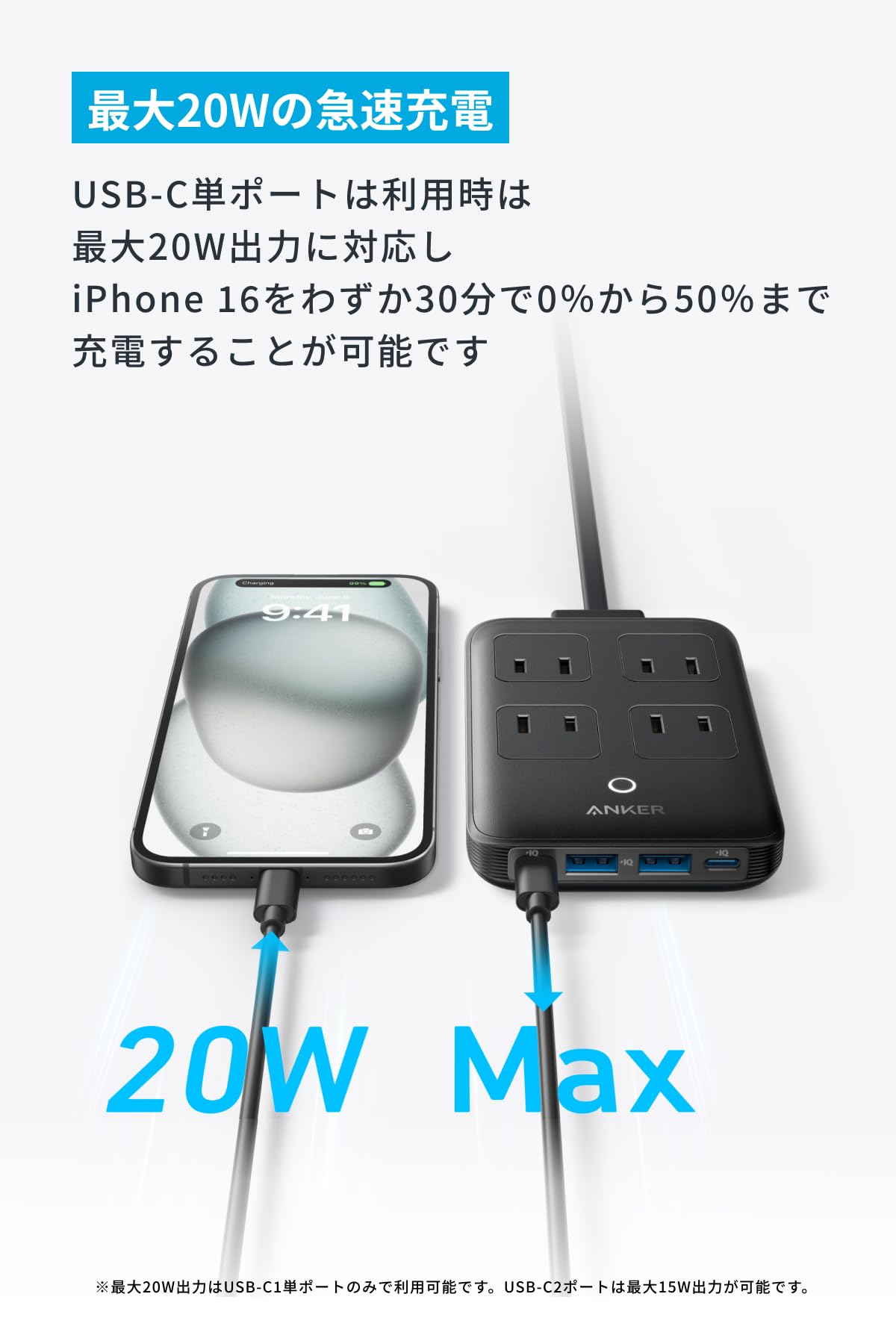■ 最大20Wの急速充電:USB-C 単ポートは最大20W出力に対応し、iPhone 16をわずか30分で0%から50%まで充電することが可能です (充電速度はAnker調べ) 。