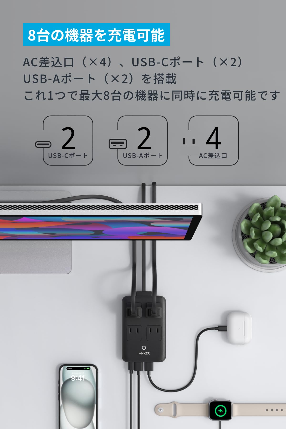 Anker Charging Station (8-in-1, 20W) USBタップ 電源タップ AC差込口 4口 USB-C 2ポート USB-A 2ポート 延長コード 1.5m) 【PSE技術基準適合】MacBook PD対応 Windows PC iPad iPhone Galaxy Android スマートフォン ノートPC 各種 その他機器対応 ブラック
