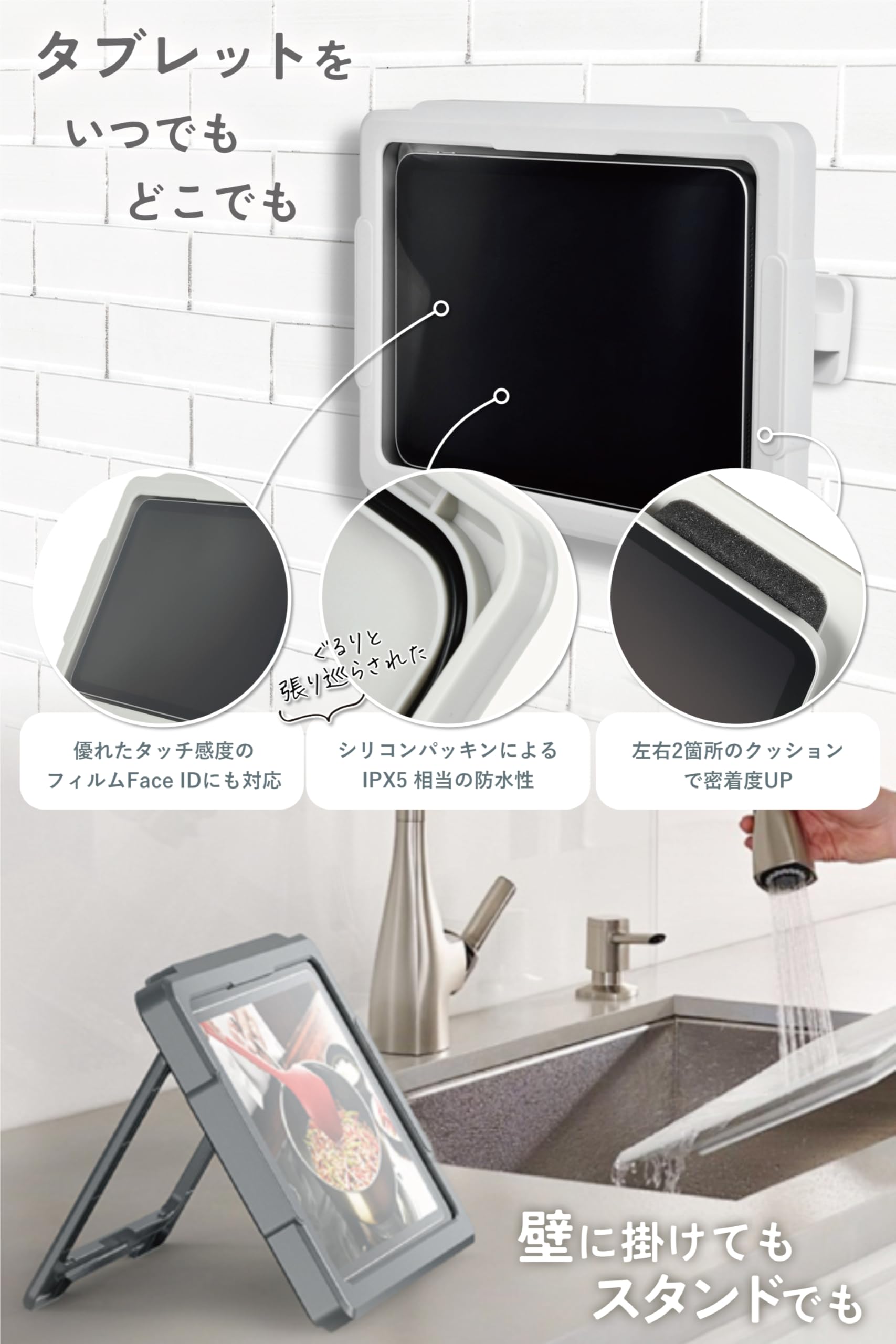 ■ 優れた防水性能で水回りでのタブレットの使用も安心安全です。