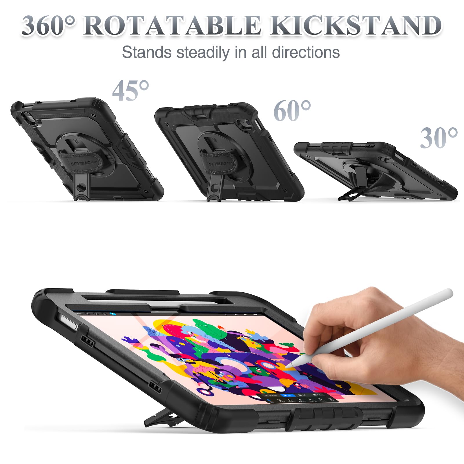 SEYMAC stock 2025年/2024年 11インチiPad Air(M3/M2)耐衝撃ケース 保護フィルム付き ペン収納 360°回転スタンド ハンドストラップ ショルダーストラップ 全面保護カバー iPad Air 11 2025/2024専用型(ブラック)