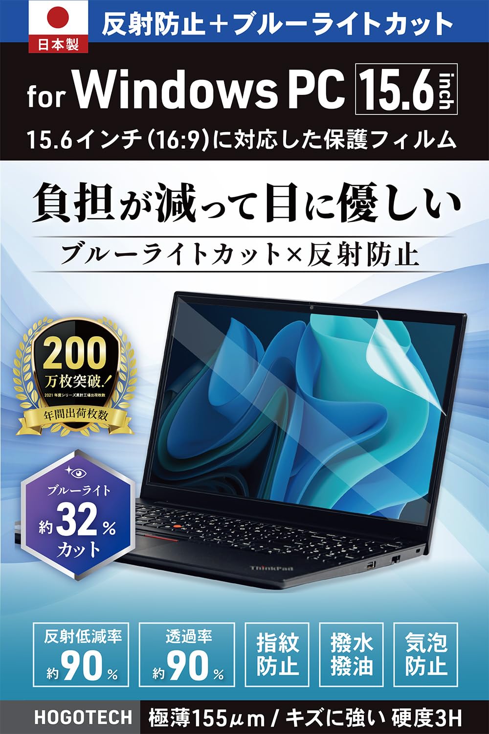 【日本製】ブルーライトカット アンチグレア Windows15.6インチ 16:9 保護フィルム 縦 194mm × 横 344mm 反射防止 気泡防止 HOGOTECH
