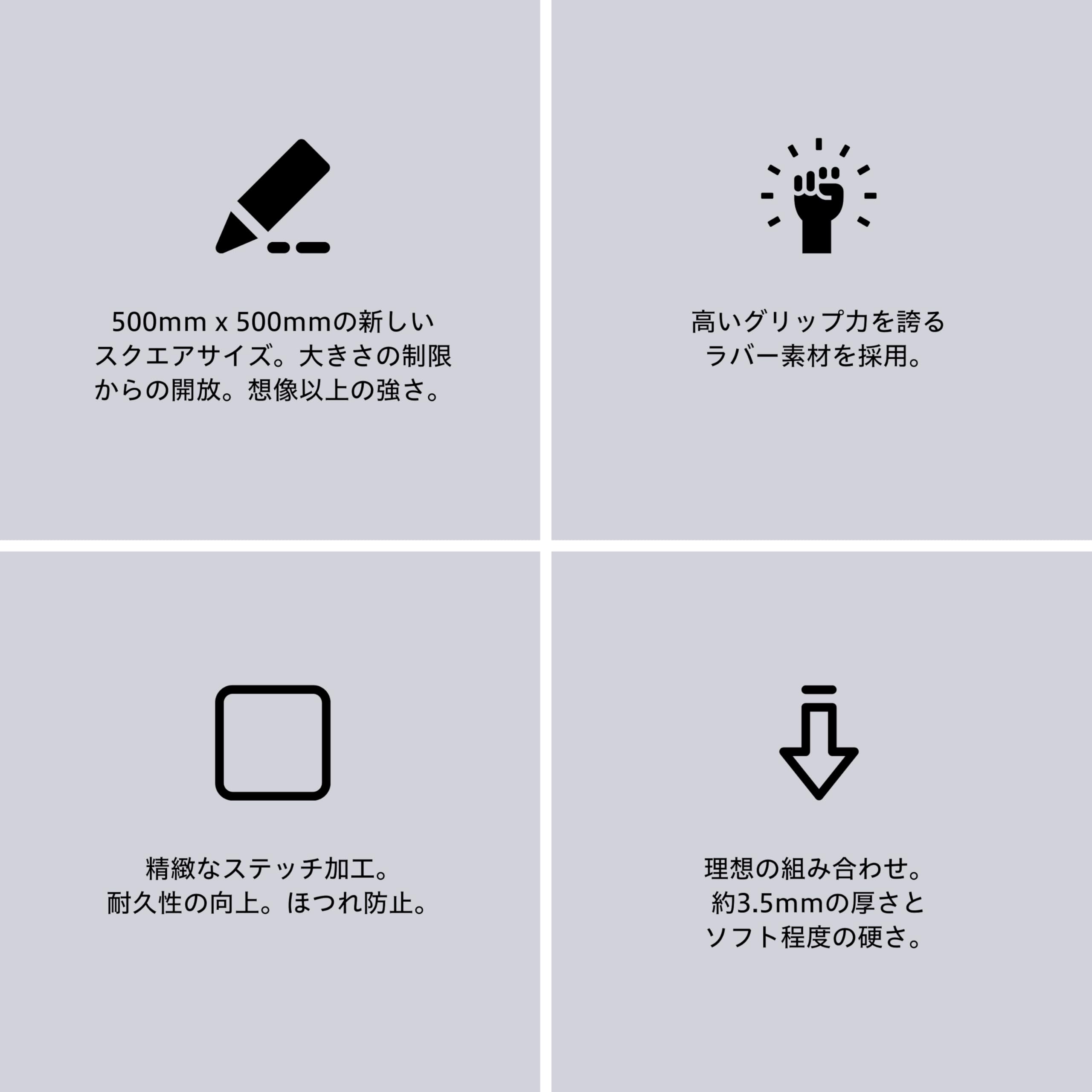 エイムのための広大な操作領域を実現する革新的なスクエアサイズは、従来のマウスパッドの枠を超えてゲームも作業もこの上ない自由を。