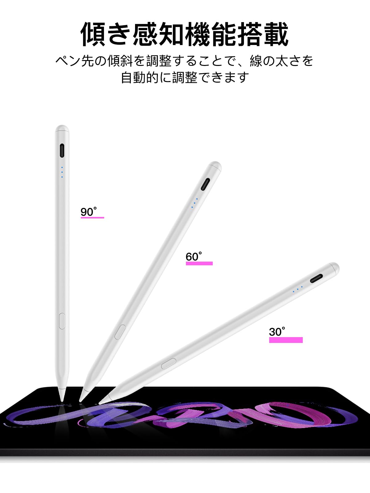 ■ [傾き感知機能&超高精度] ペン先の傾きに応じて線の太さを自動調整し、ペン先の傾斜角度が大きいほど線が太くなる。