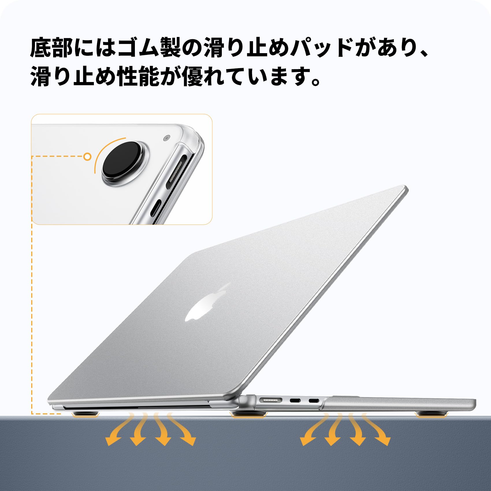 滑り止めパッドによって少し高さを出すデザインとなっており、机などの接地面とマックブックの底部の間に空間を作ることによって、空気が循環しやすくなります。