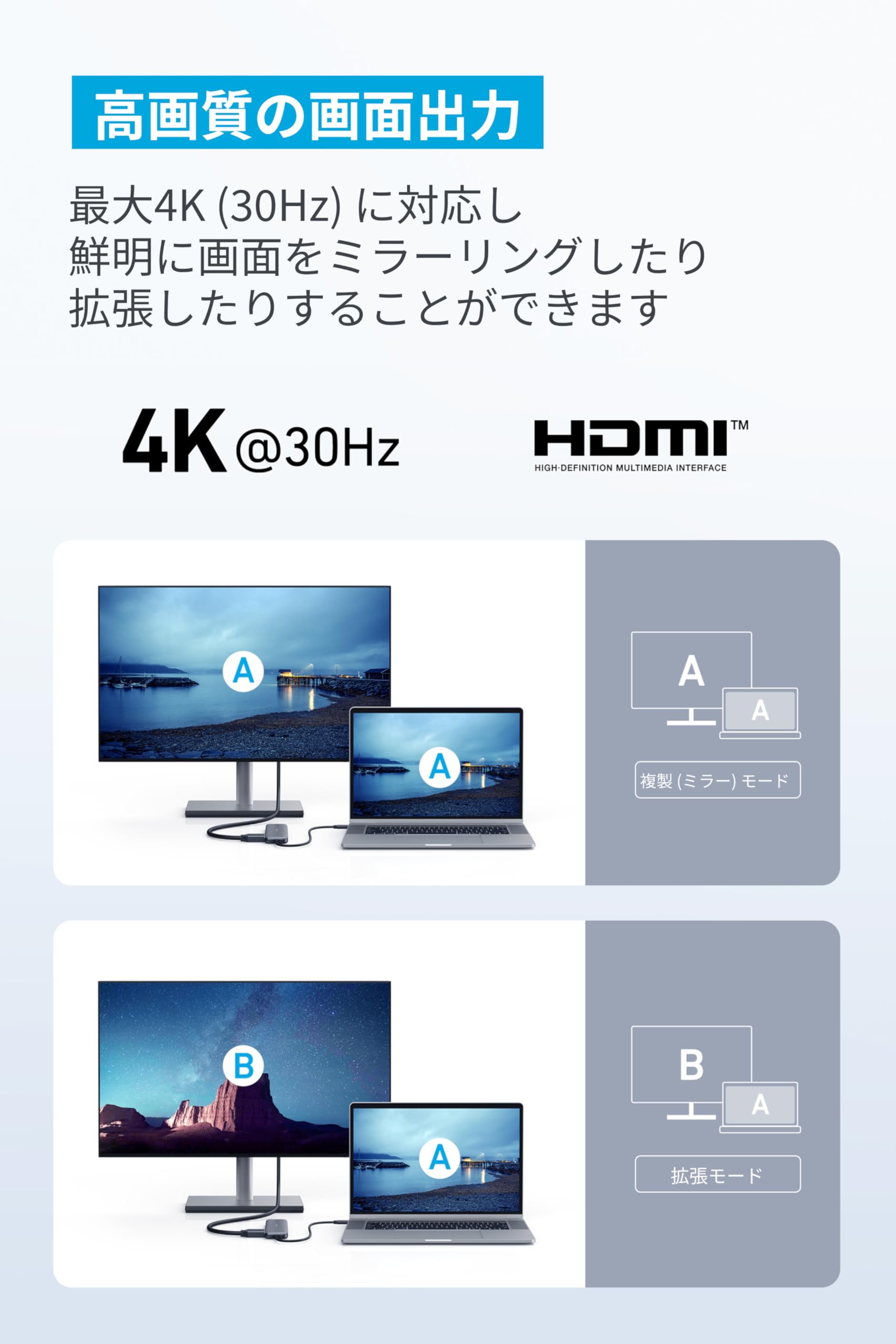 ■ 高画質の画面出力:HDMIポートを使用して、最大4K (30Hz) の画像出力が可能です。
