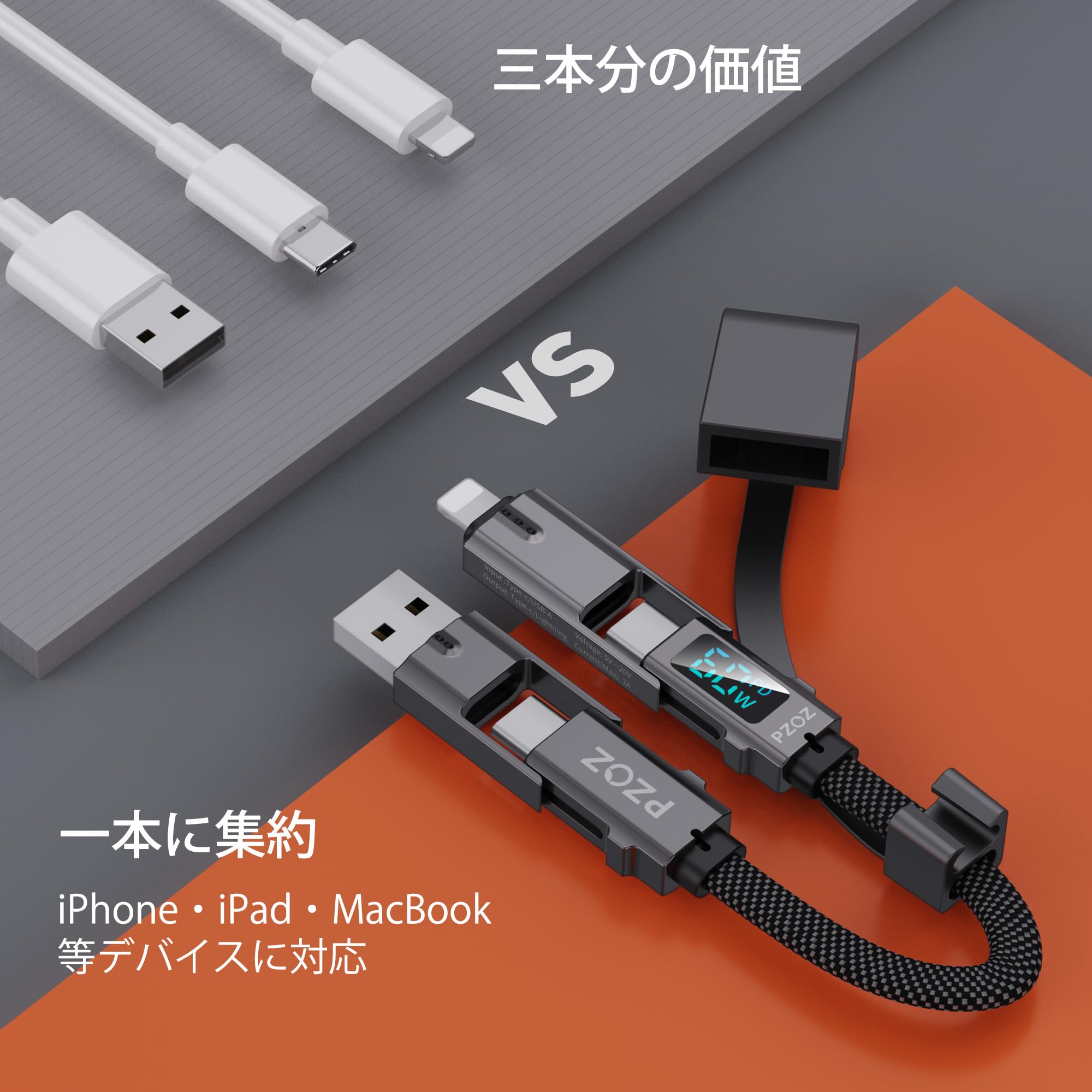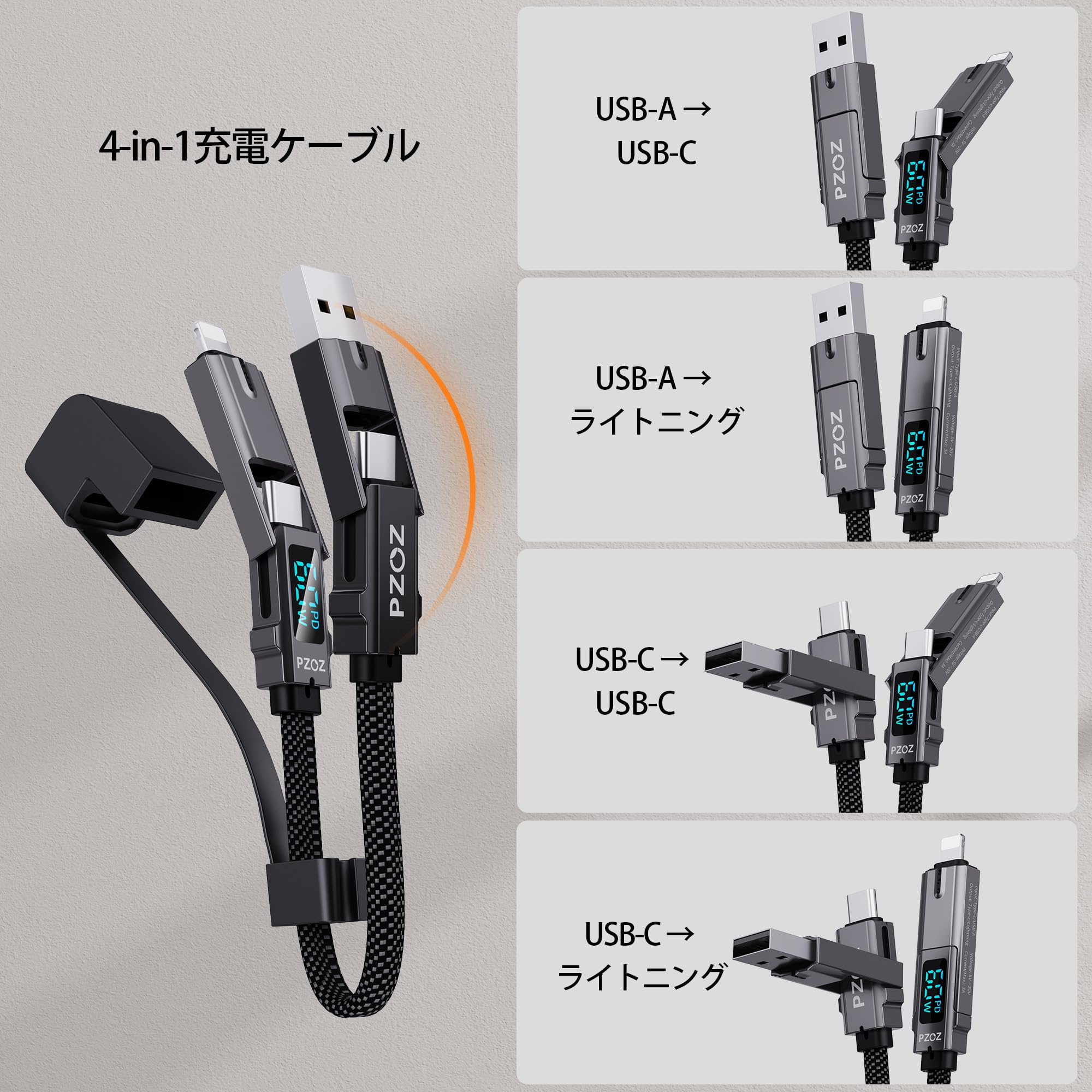 PZOZ 4in1 マルチ充電ケーブル LEDディスプレイ 60W ケーブル USB C to A/タイプc to ライトニング/USB A to USB C/USB A to Lightning PD 5A 急速充電 Macbook/iPhone/iPad/Samsung Galaxy/Google Pixel/Switch 対応