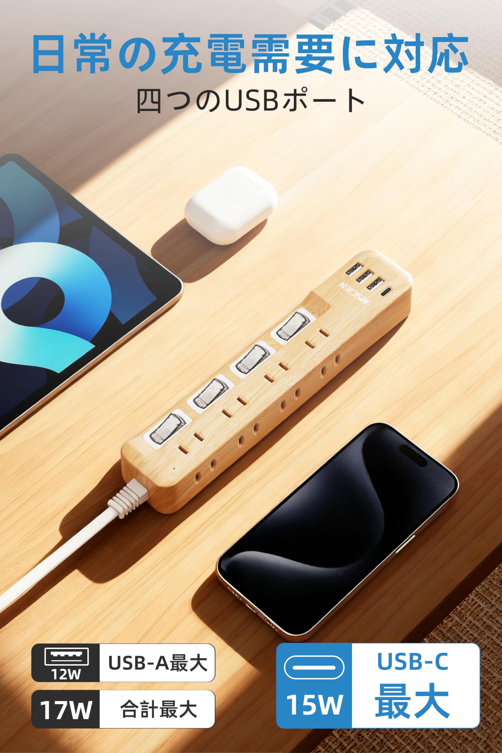 Mscienエムサイン 延長コード 3m 電源タップ usb付き 雷ガード 8AC口 3usb-a 1usb-c マルチタップ スイッチ たこあしコンセント 分岐 oa テーブルタップ スイングプラグ 壁掛け 木目調